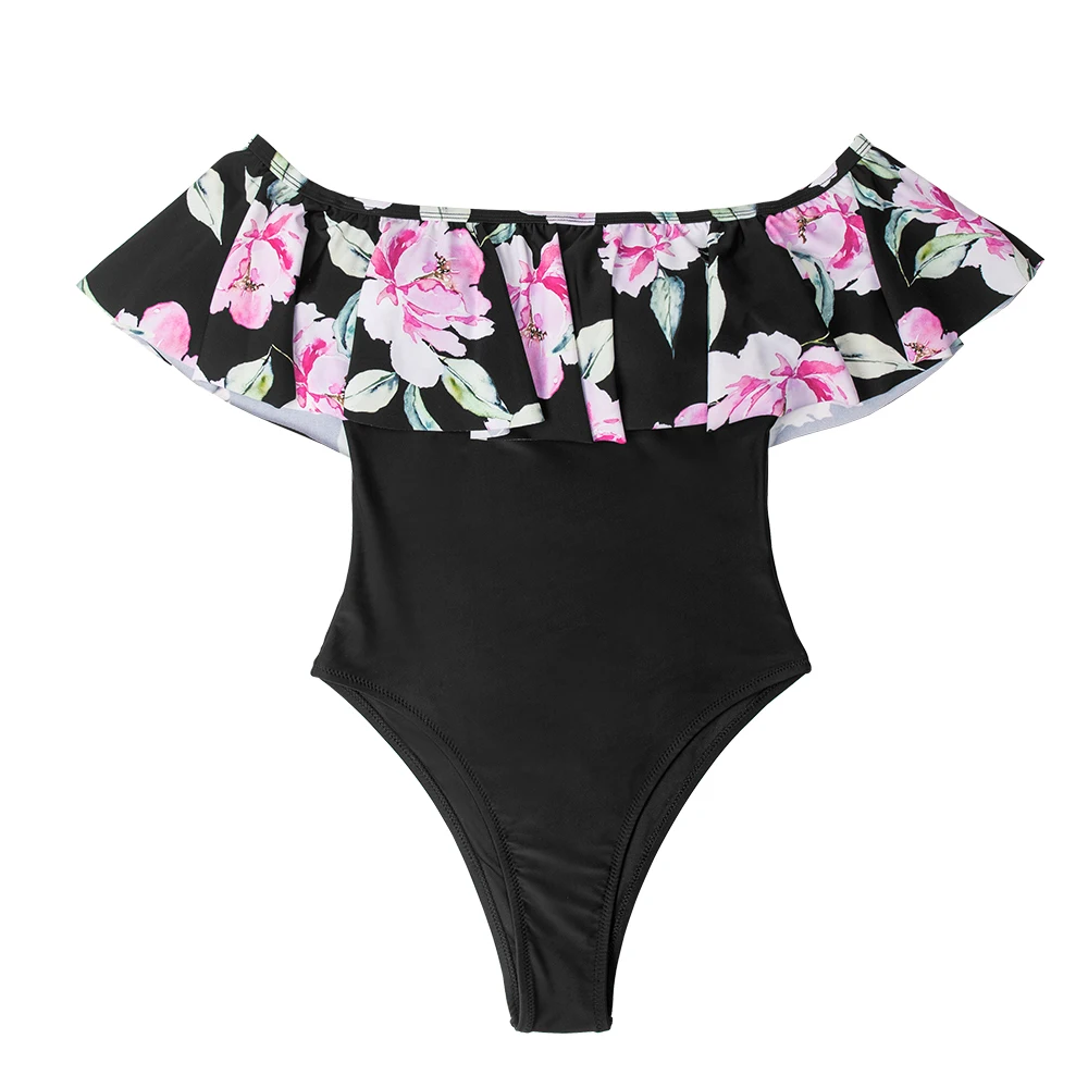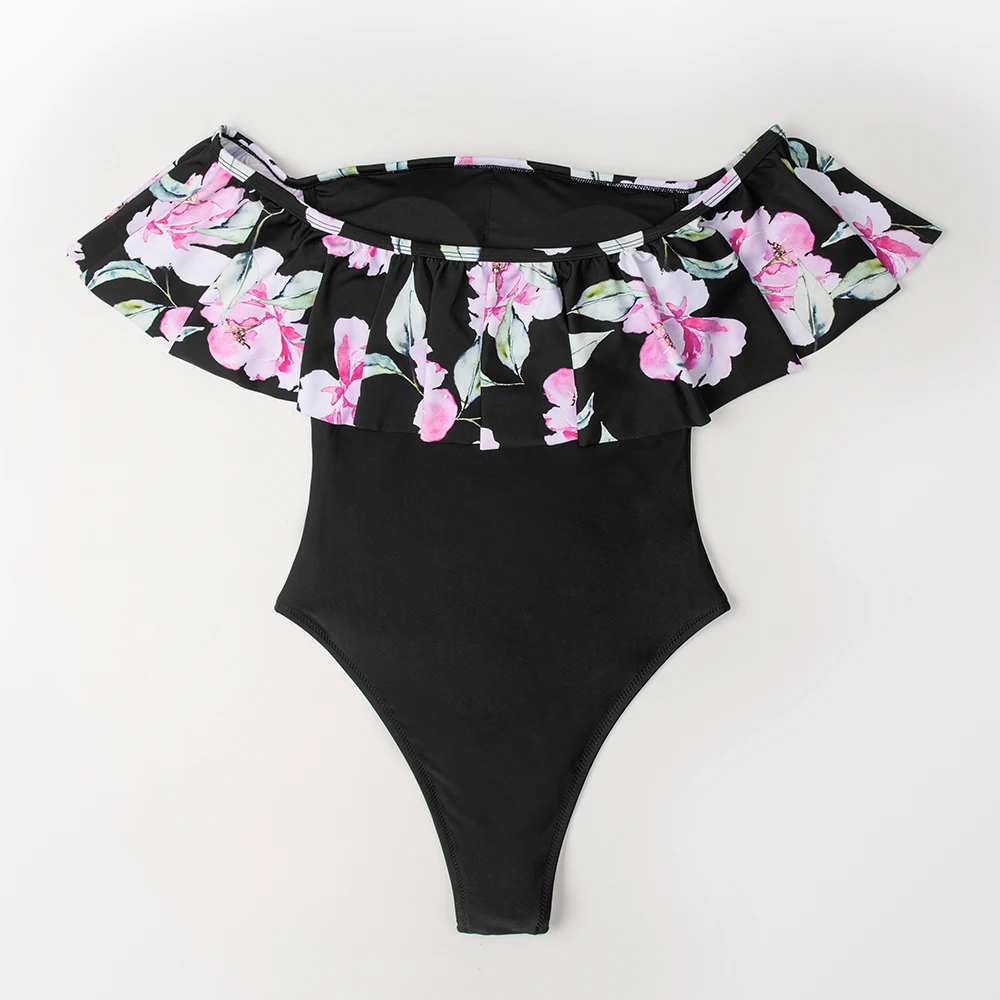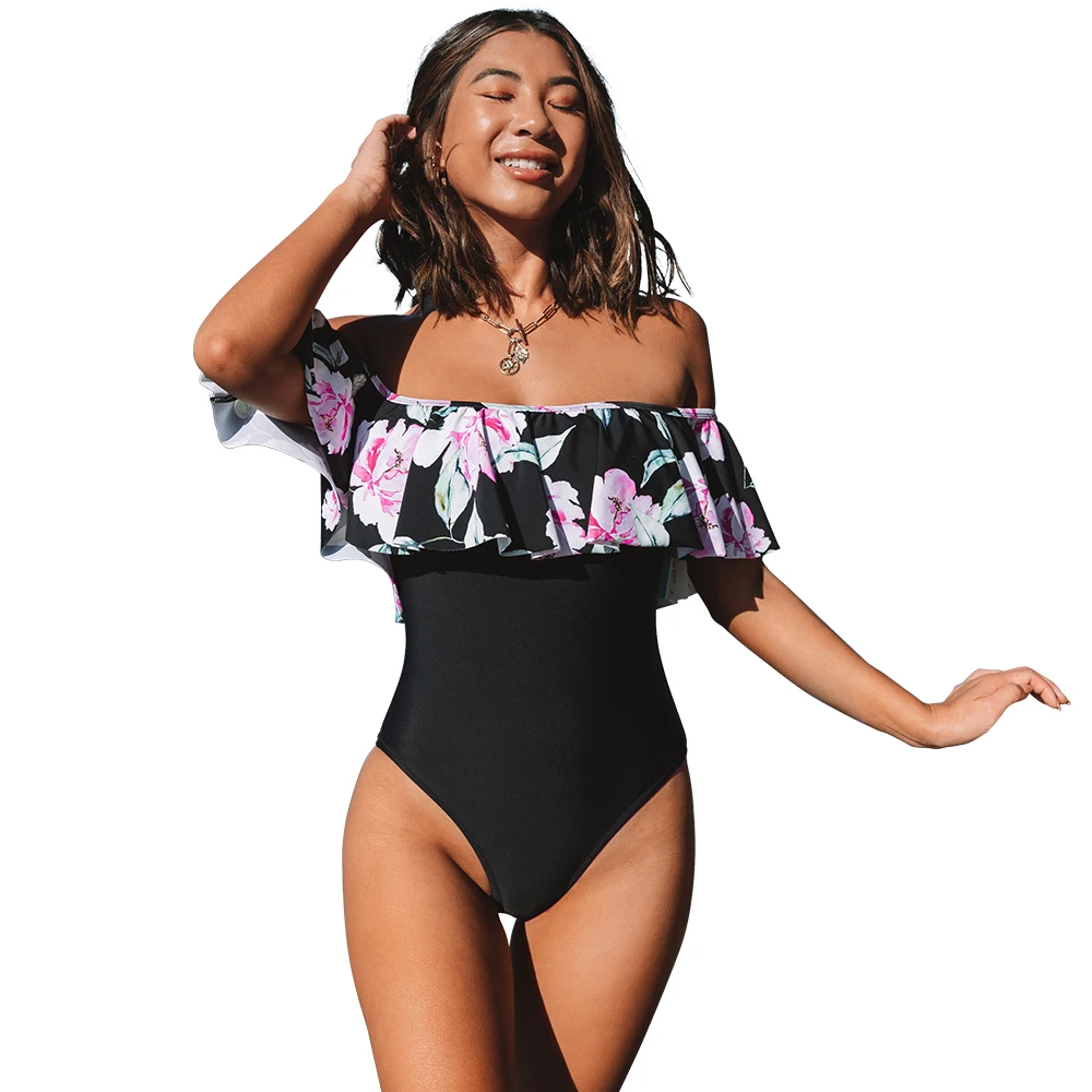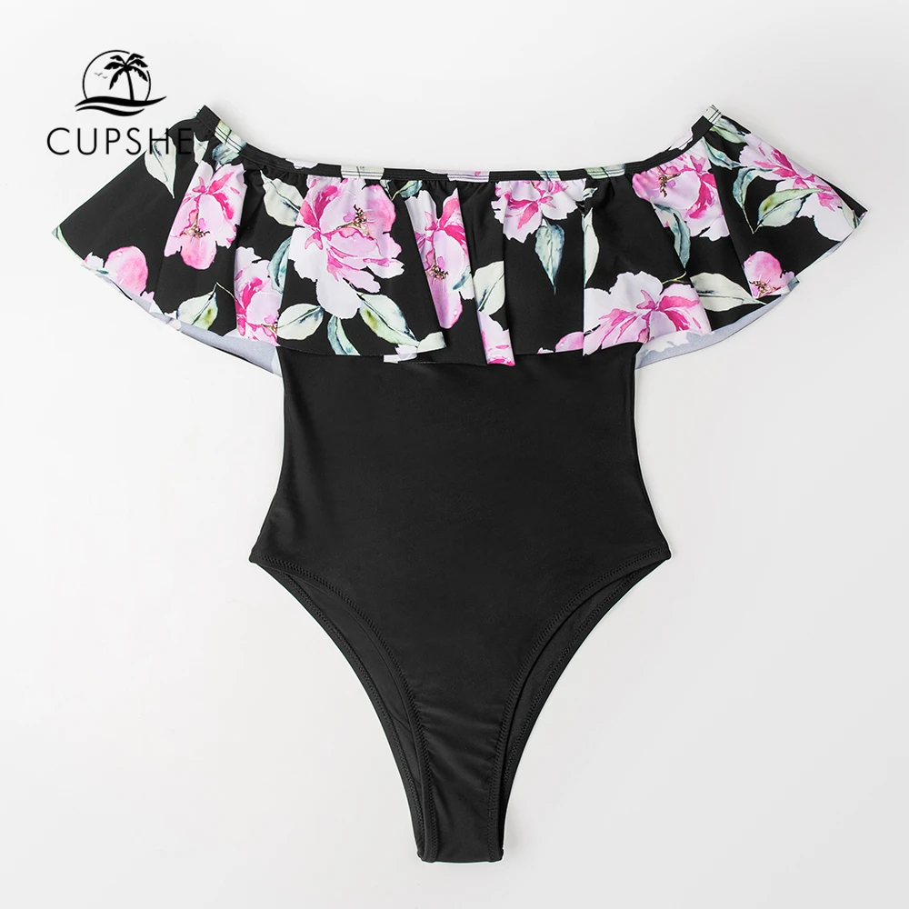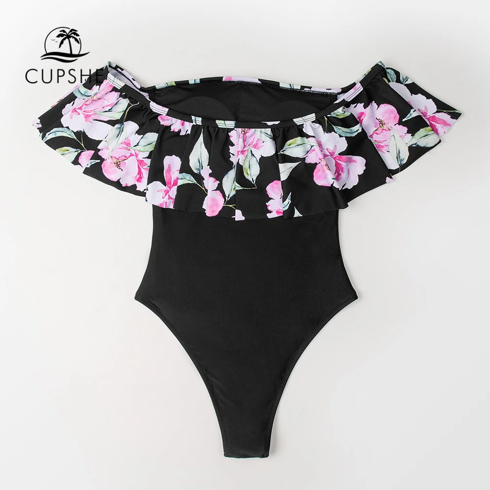 CUPSHE с открытыми плечами гофрированный Цельный купальник сексуальный черный цветочный женский Монокини 2022 Новый женский Пляжный купальный костюм