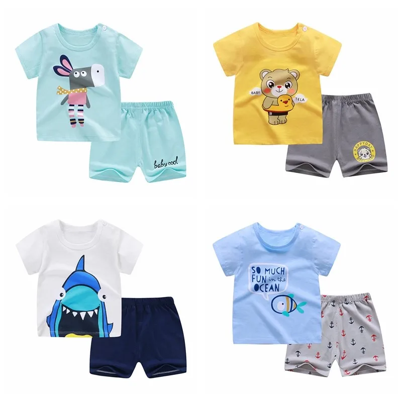 Детский хлопковый костюм с коротким рукавом, летняя тонкая одежда из двух предметов с круглым вырезом для маленьких мальчиков и девочек