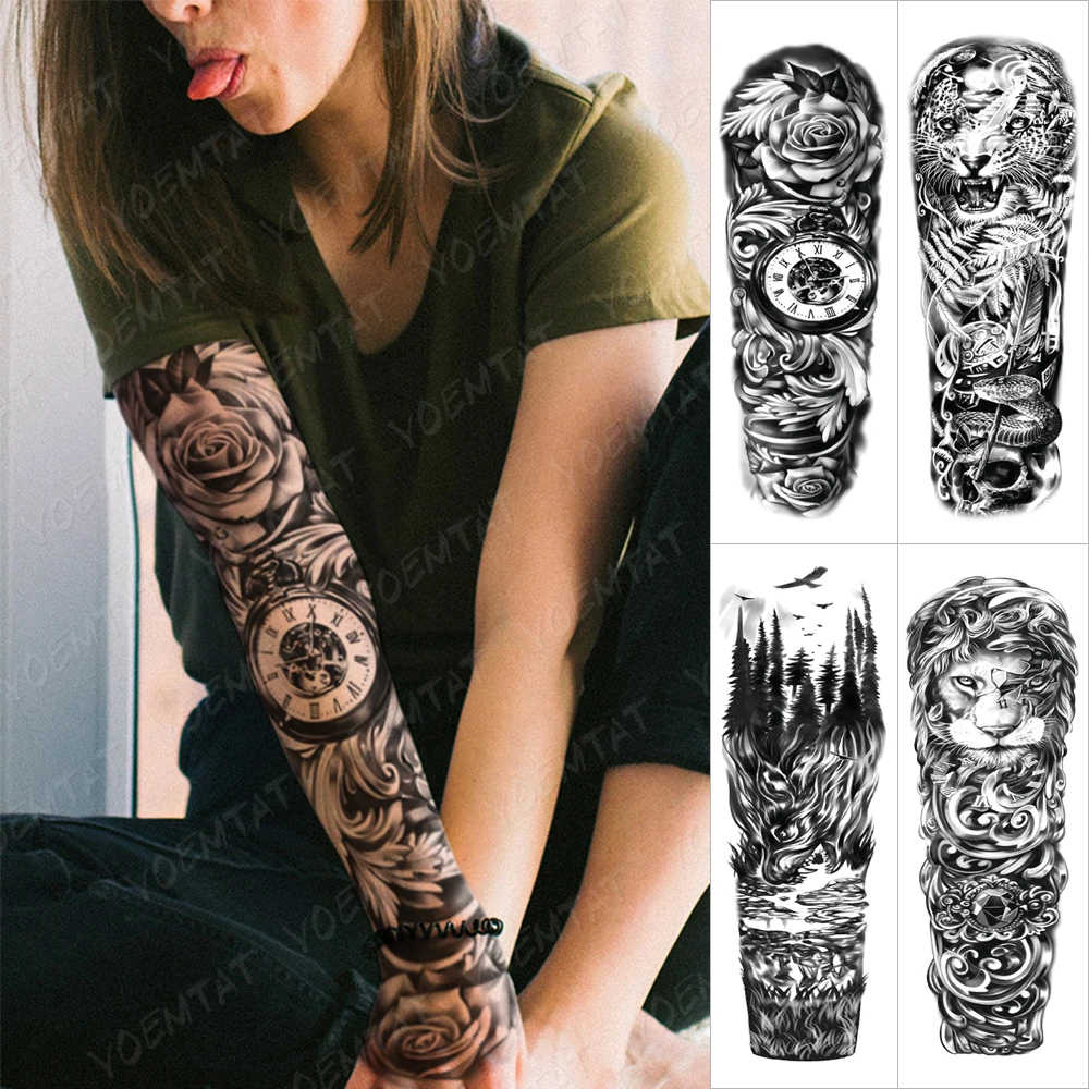 татуировки временные наклейки тату Большой рукав на руку, тату, розы, цветы, часы, водонепроницаемые, наклейка, карманные часы, время, боди-арт, полностью искусственная татуировка для женщин