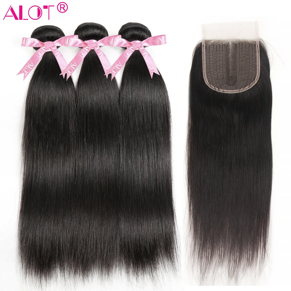 Бразильские прямые пучки волос с закрытием пряди со средней частью, закрытие шнурка, не Реми, человеческие волосы для плетения, 4 шт.