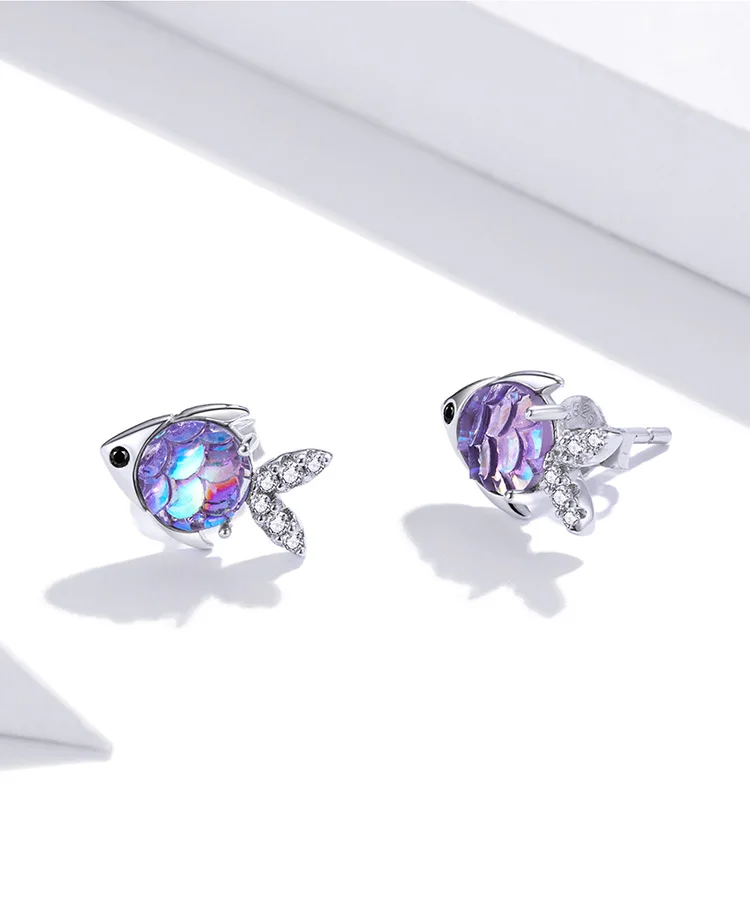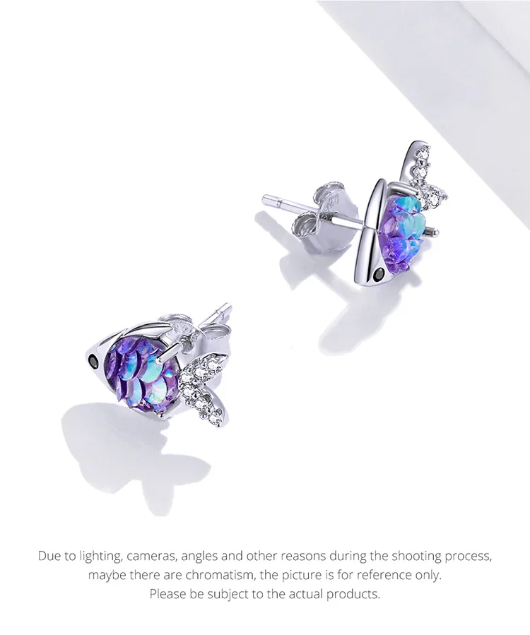 Серьги-гвоздики женские из серебра 100% пробы с тропическими рыбкам...