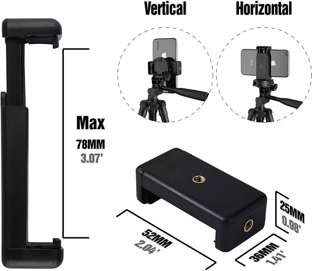 Товар: крепление штатива для телефонаМаксимальная высота: 100 смМинимальная высота: 35 смДлина в сложенном виде: 36 смМакс. Диаметр трубки: 16,8 ммРегулируемая ширина держателя телефона: 52-85 ммТолщина: Макс. 18 ммМаксимальная нагрузка штатива: 3 кгРазмер винта: 1/4''Цвет: серебристый/черныйМатериал: алюминий