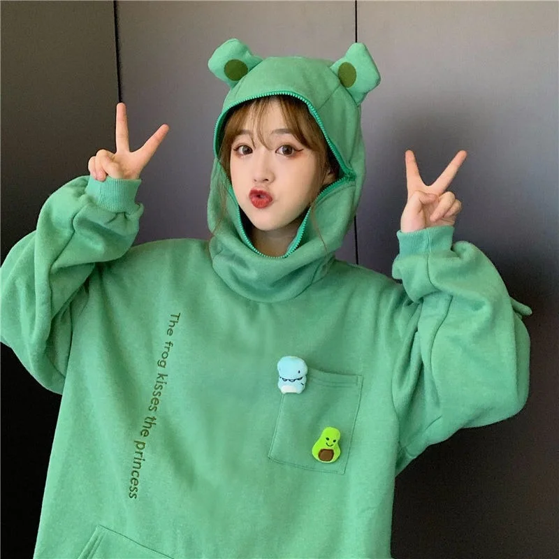 Толстовка Deeptown женская с лягушкой, утепленная флисовая Толстовка свободного кроя, свитшот, пальто, верхняя одежда, пуловер с капюшоном, мягкая одежда для зимы