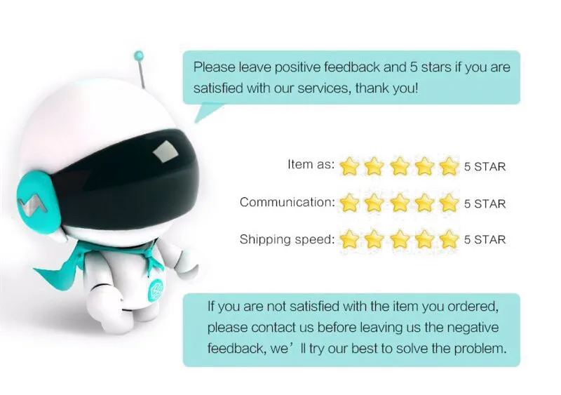 Отзывы в очень важен для нас:1. Если вы удовлетворены нашими товарами и услугами, пожалуйста, оставьте положительотзывы в с оценкой 5 звезд.2. Пожалуйста, свяжитесь с нами, прежде чем оставить нейтральный или отрицательный отзывы в. Мы сделаем все возможное, чтобы предоставить вам лучшее обслуживание клиентов.