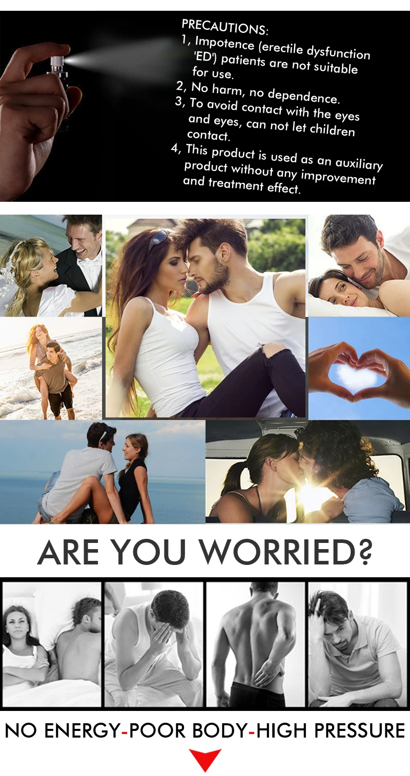 Спрей с задержкой эякуляции для мужчин от преждевременной эякуляции, продление на 60 минут, спрей для увеличения члена, усиление эрекции членаИспользование: Задержка времени эякуляции мужчин, улучшение качества сексуальной жизни пар и увеличение веселья пар. Как использовать: Распылите этот продукт на головку пениса и коронарный сулькус за 30 минут до полового акта, затем равномерно распределите. Меры предосторожности при использовании: 1. Не распространяйте мочевой раствор 2. Пожалуйста, Вымойте в теплой воде, если есть дискомфорт после протирания 3. Для орального секса промойте изделие через 30 минут после распыления 4. Этот продукт нельзя использовать на коже с сыпью, абразивной раной или аллергией.