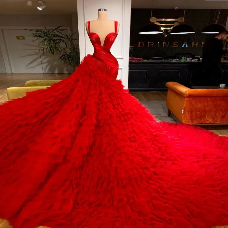 Красное Атласное и Тюлевое вечернее платье на тонких бретельках, женское платье с пышным шлейфом для выпускного вечера, вечерние-Русалка на молнии с оборками на спине, вечернее платье