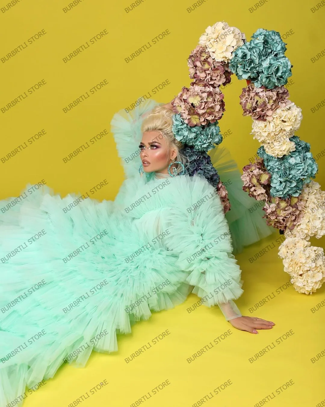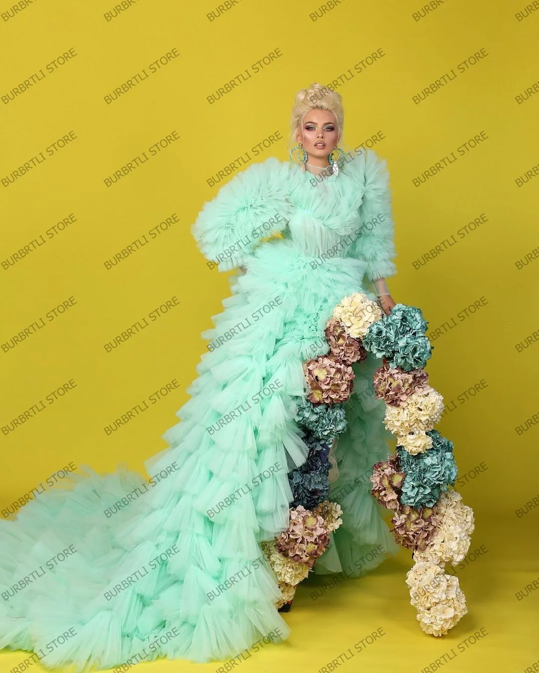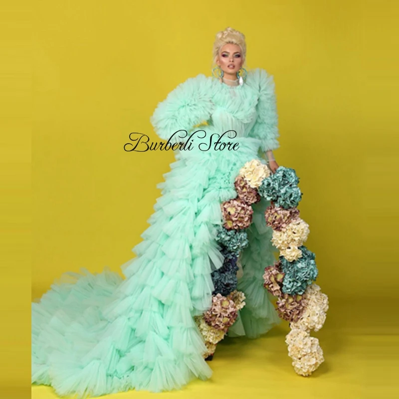 Модное Мятное пушистое Тюлевое платье А-силуэта для выпусквечерние вечера с длинными рукавами-фонариками сексуальное длинное официальное платье с разрезом сбоку