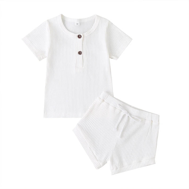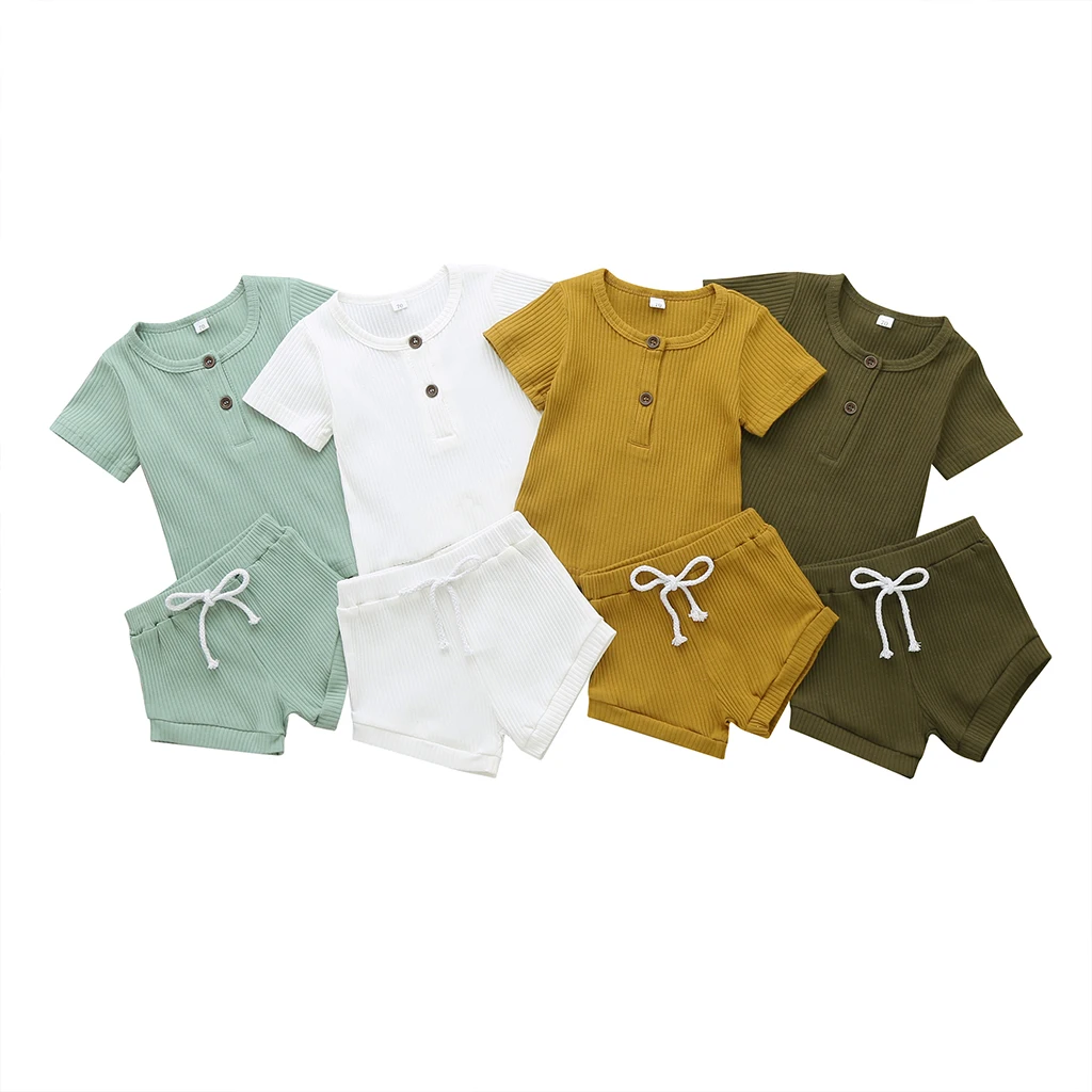 Комплект детской одежды, комплект из двух предметов твердые ребристые комплекты футболка с короткими рукавами и круглым вырезом на пуговицах Топы Шорты PP для маленьких девочек летние комплекты для мальчиков, размер от 6 до 24 месяцев