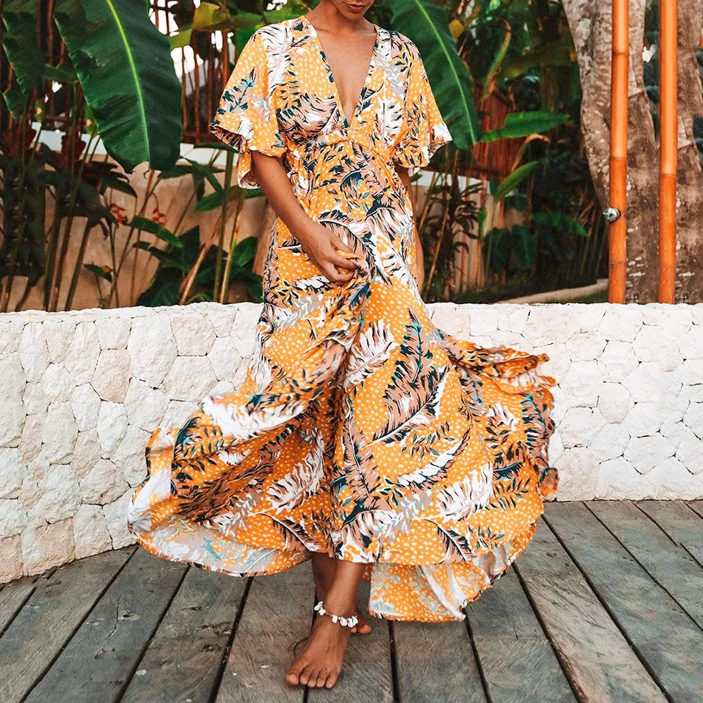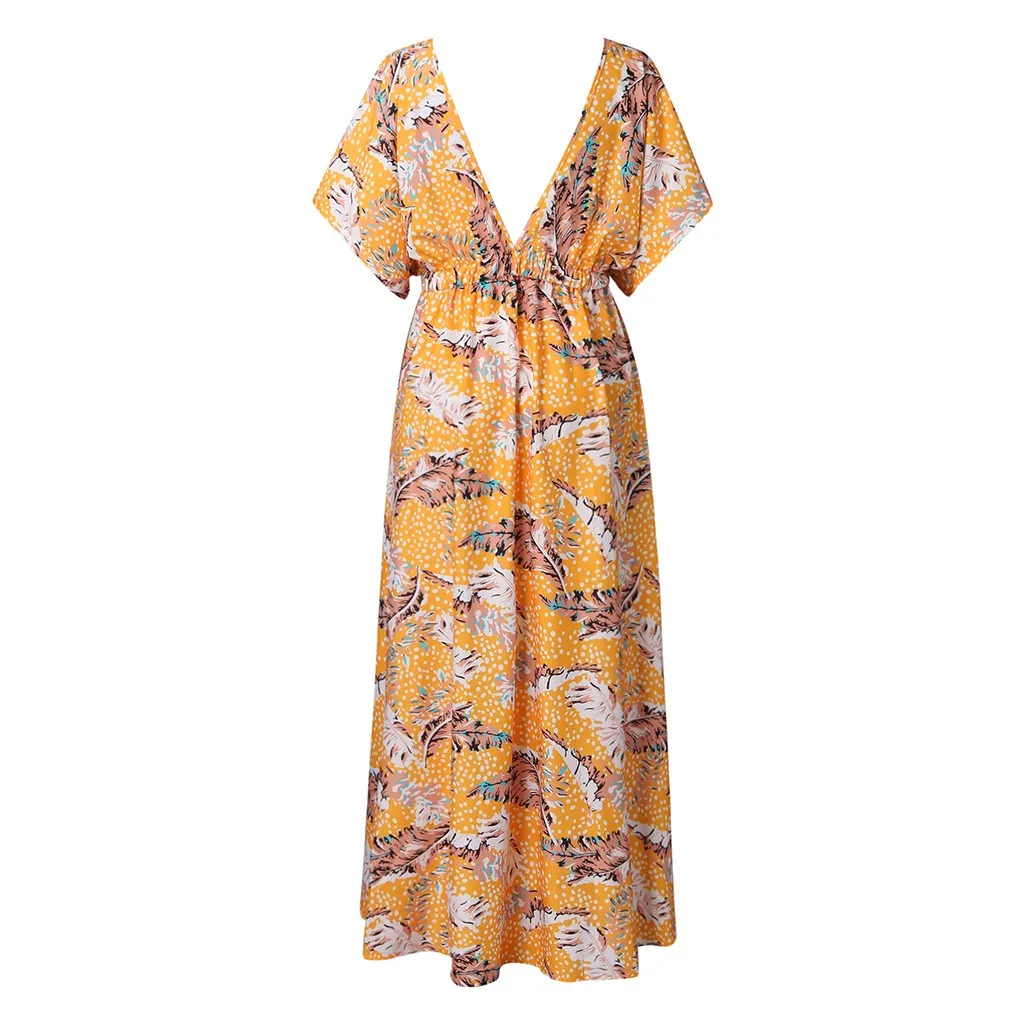 Это повседневное платье Особенности: дизайн с богемным принтом, v-образный вырез с коротким рукавом для фиксации и модный дизайн. Легкая и неэластичная ткань. Свободный силуэт.