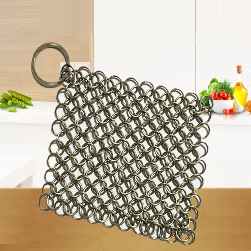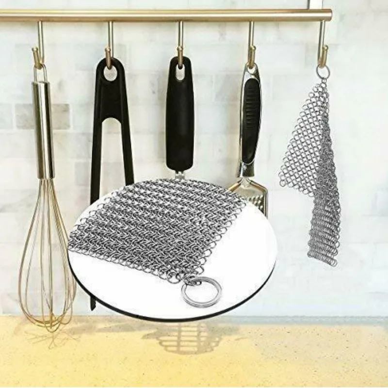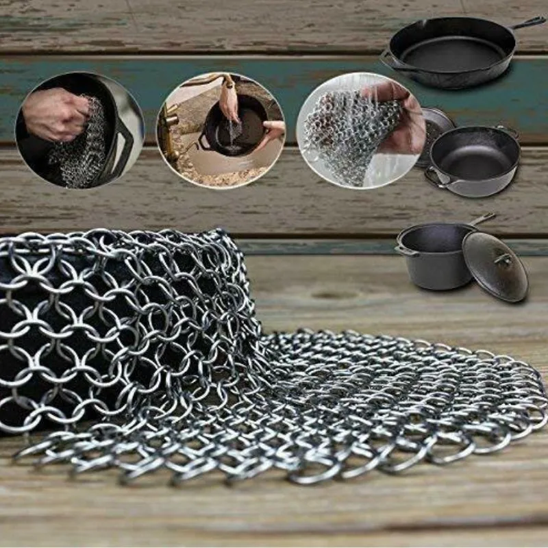 Нержавеющая сталь чугунная сковорода очиститель для очистки бензопилы скруббер с подвесным кольцом для чугунной сковороды, предварительно приправленная сковорода, сковорода