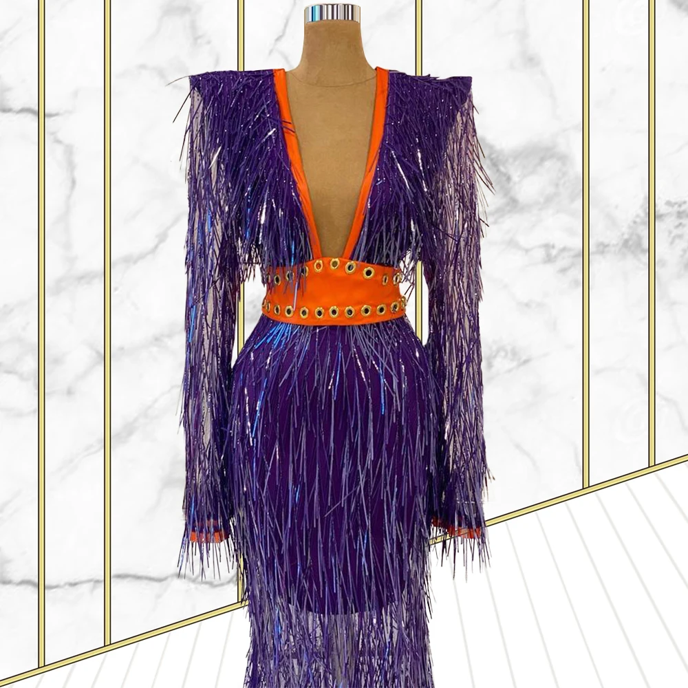 Роскошные фиолетовые вечерние платья, женские платья с длинным рукавом, бахромой и глубоким V-образным вырезом, Женский коктейльный повседневный наряд для клуба, конкурса, выпускного вечера