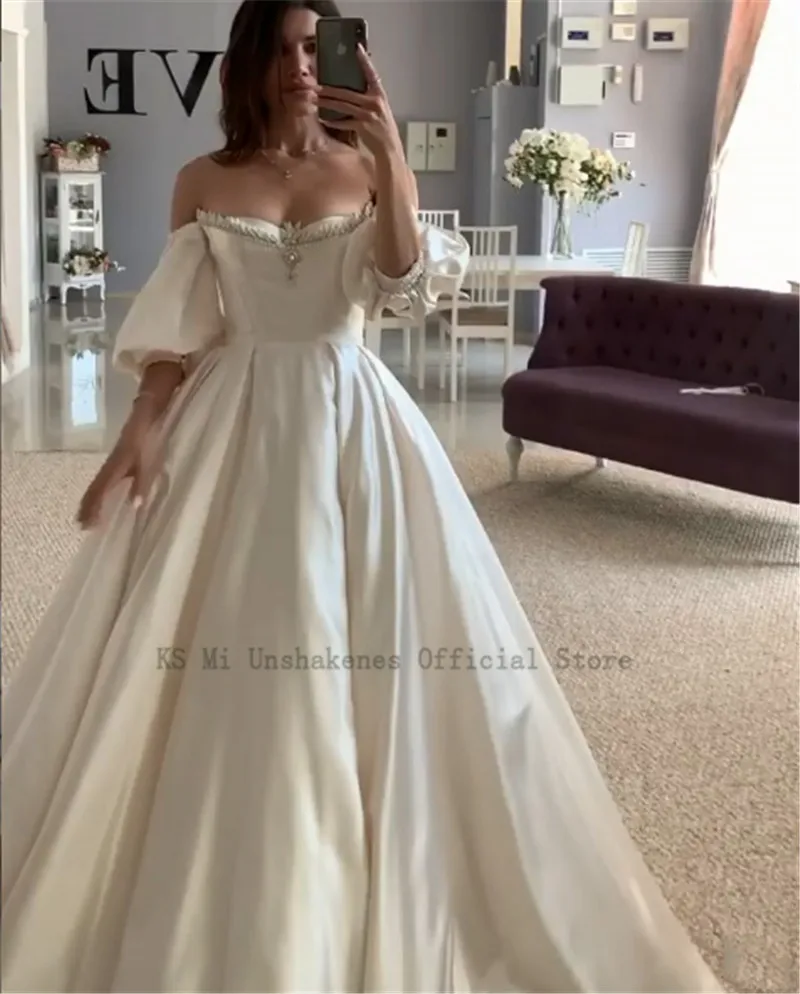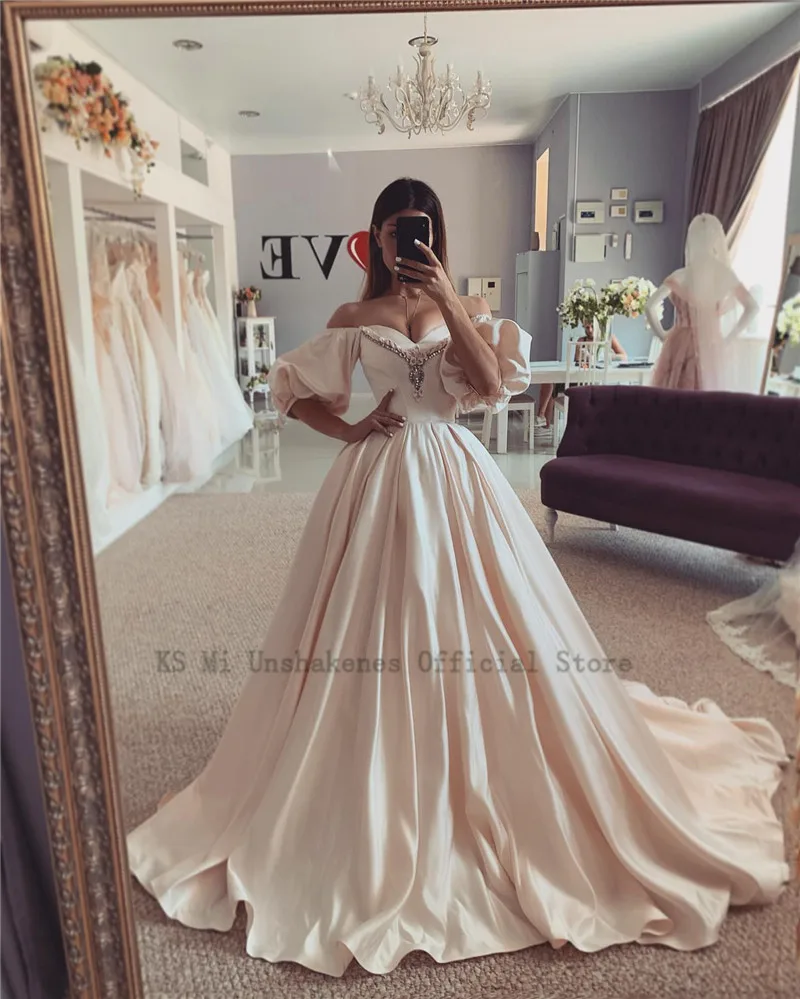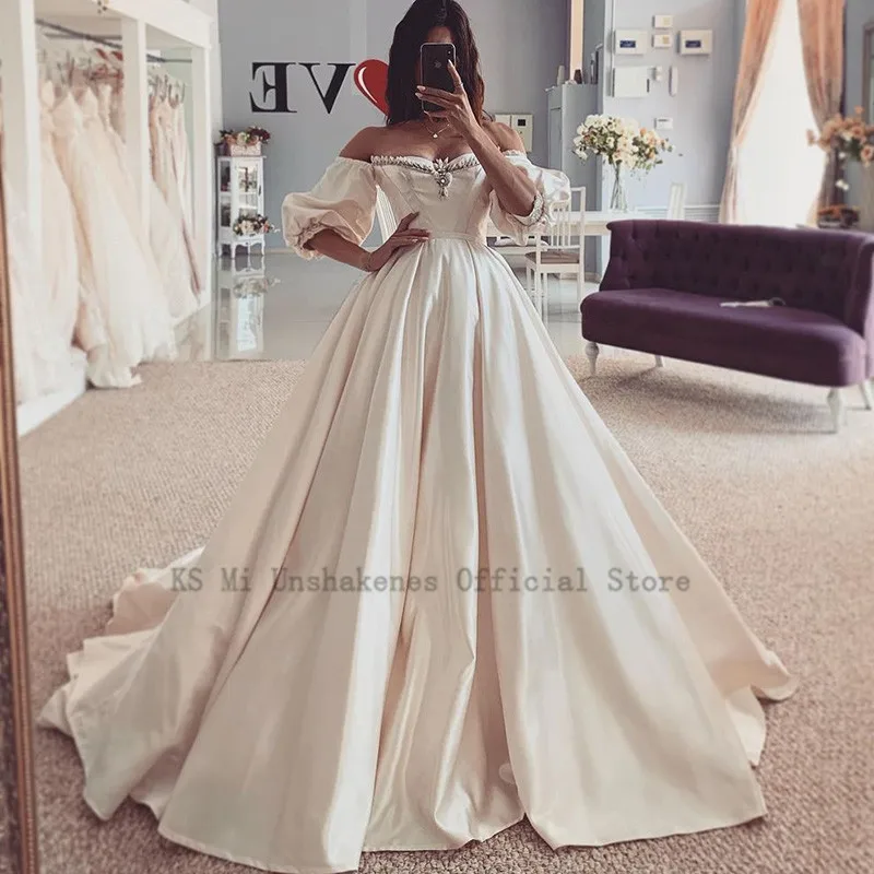 Атласное свадебное платье цвета шампанского, 2021 настоящие Свадебные платья с пышными рукавами, винтажные свадебные платья принцессы с кристаллами, со шнуровкой сзади