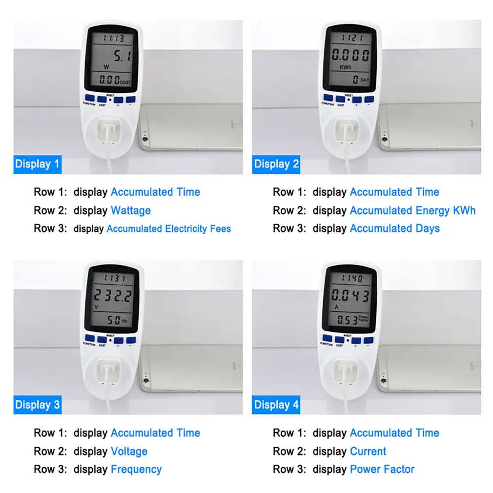 Он может измерять различные параметры, такие как Мощность (Вт), энергия (кВтч), вольт, ампер, герц, коэффициент мощности и Максимальная мощность (Вт), время, дни.