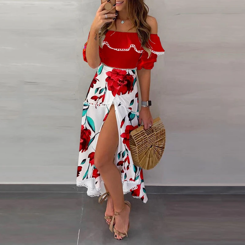 Женский модный комплект из двух предметов, праздничная пляжная одежда для отпуска, топы с открытыми плечами и юбка с оборками и разрезом