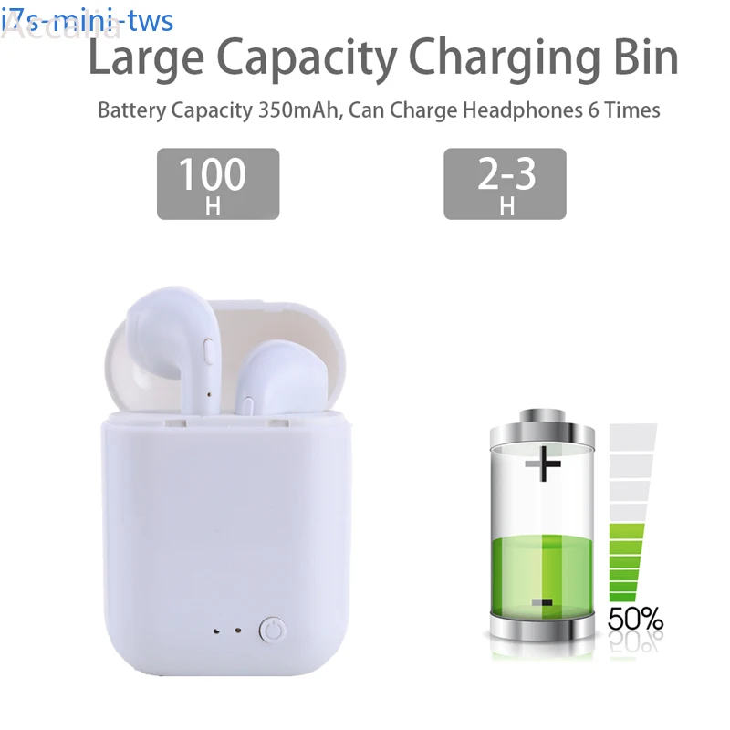 Особенности: Номер модели: I7S-Mini-TWSВерсия Bluetooth: Bluetooth 5,0Дальность передачи: внешнее расстояние прямой линии 10-15 метровЕмкость аккумулятора: полимерный литиевый аккумуляторФункция быстрой зарядкиВремя прослушивания музыки в формате HD: около 2 часовВремя разговора: около 2,5 часовВремя в режиме ожидания: 130 часаВремя зарядки: 1-2 часа Список аксессуаров:2 гарнитуры TWS Bluetooth (левый и правый беруши)1 х зарядная коробка1 x USB-кабель для зарядки1 х Руководство пользователя