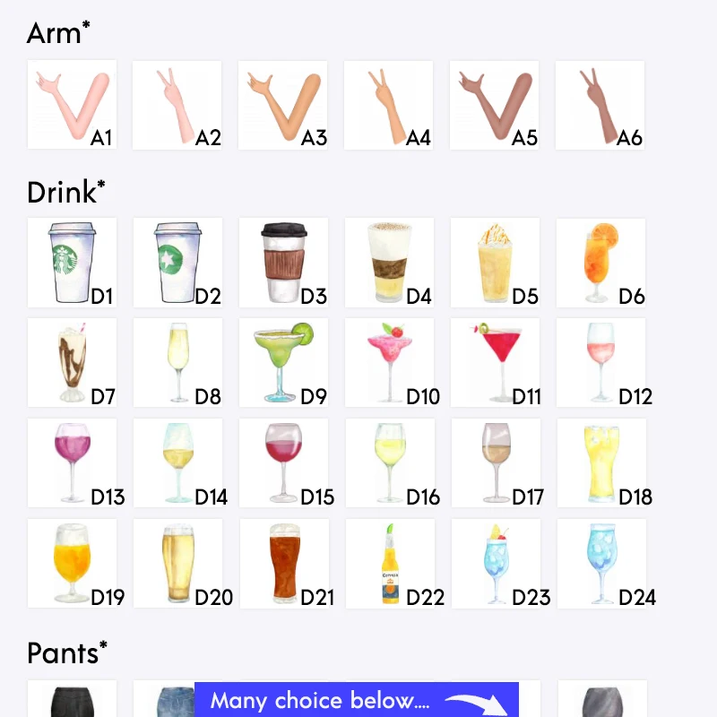 Добавьте вашу персонализацию:Пожалуйста, скопируйте/вставьте информацию ниже, ответьте на каждый или используйте изображения в качестве руководства:Человека 1/2/3/4 Название:Стиль волос: пучок волос/средняя спина/длина плеча/длина шеи/верхняя часть спины или завязывать волосыНомер стиля волос: стиль руки:Стиль брюк:Дополнительно: