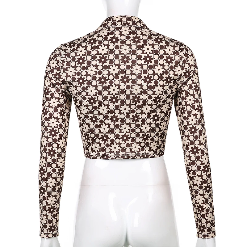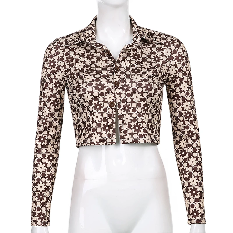 Женский винтажный кардиган на пуговицах, коричневый цветочный укороченный Топ с длинным рукавом и отложным воротником, весна 2021