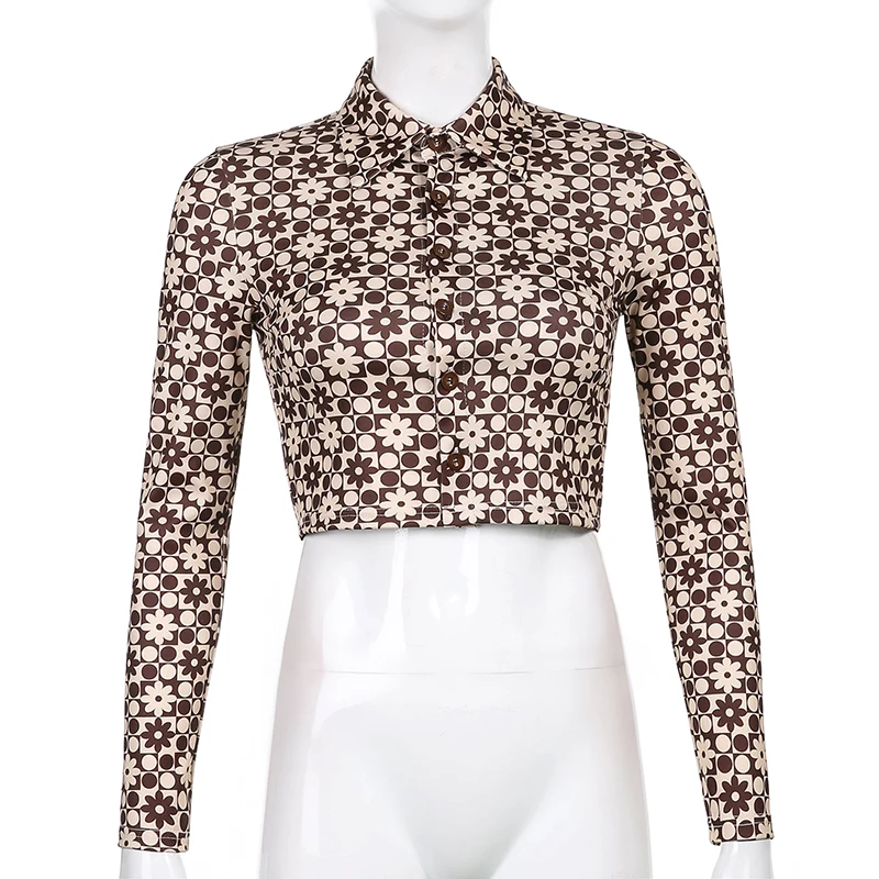 Винтаж 90s Цветочный принт Коричневые рубашки Y2K уличная одежда с ...