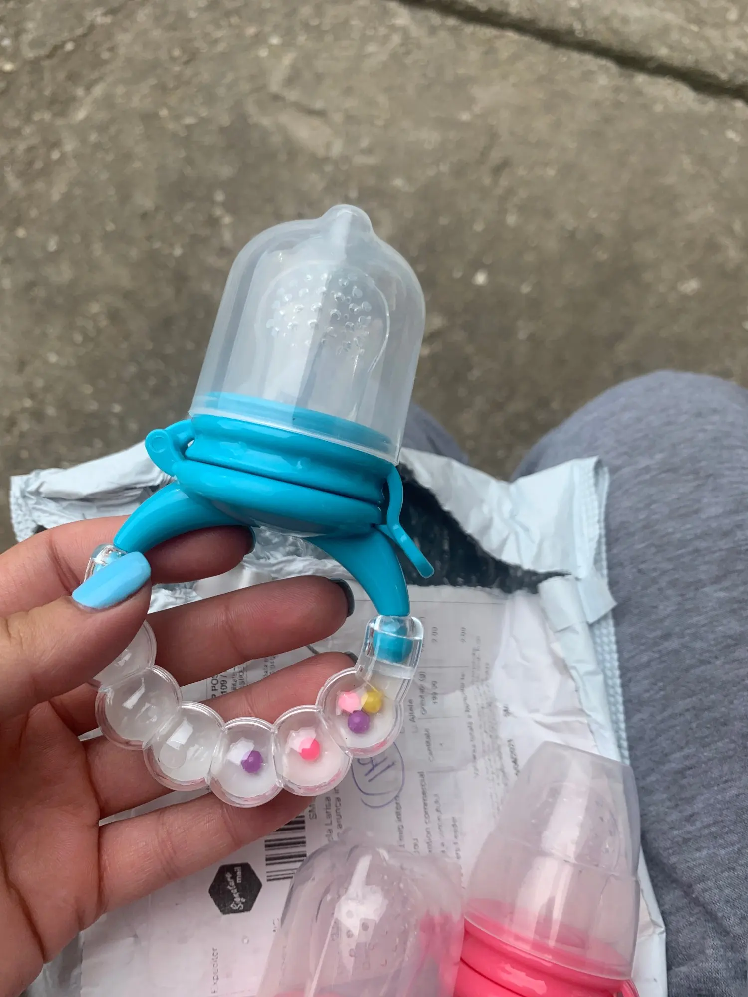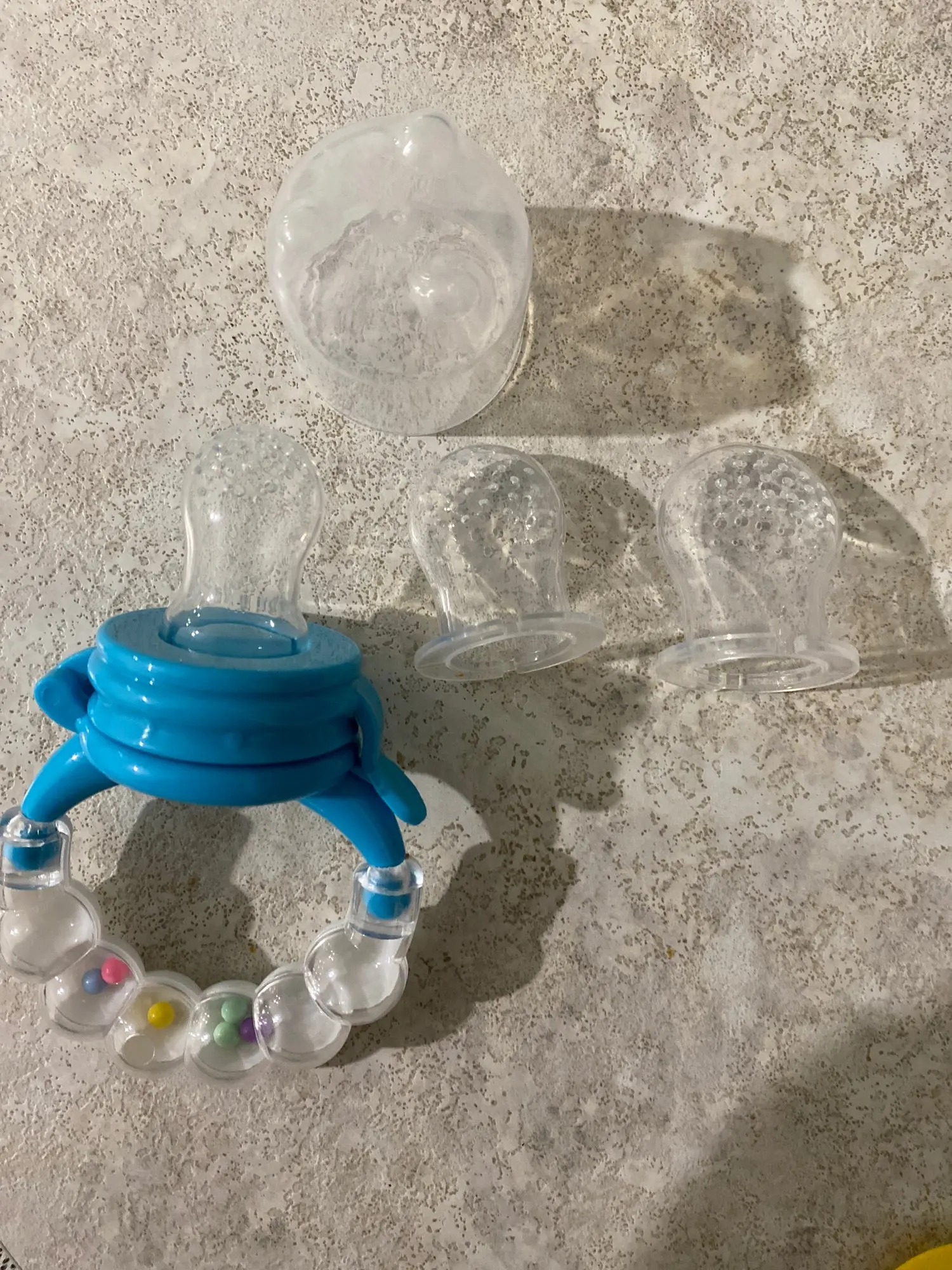 как на фото. выдержал стерилизацию. цвет и форму не потерял. насадки мягкие. можно использовать как погремушку)