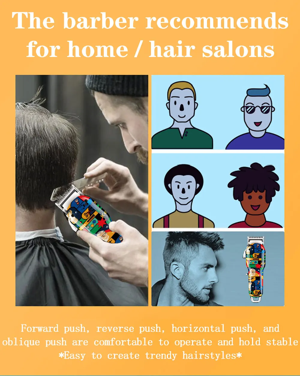Масляная голова с нулевым расстояниемТ Тип 0 режущая головка ультра-короткий шаг зуба не повреждает кожу головы,Не замораживает, волосы отрезаны на ощупь, легко моются, острыеИ не ржавыйМощный мощный двигательСильная мощность, стабильный и низкий уровень шума, длительный срок службы, гладкая иГладкие волосы, не бойтесь мягких и жестких волос различных типовВнешний вид металлической алюминиевой трубкиЦилиндрический корпус с удобной рукояткой, светильник с роскошным бриллиантом, вертикальныйПолоски, гладкая текстура, удобный захват, стильный внешний вид