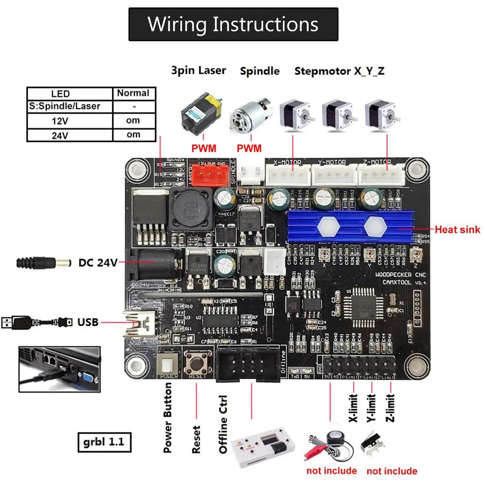 2-в-1 15 Вт лазерный граверОбновленная версия CNC 3018 Pro-M гравировальный станок,GRBL управления 3 оси Pcb фрезерный станок, древесины маршрутизатор гравер 【Новый общий язык 】 2-в-1 с ЧПУ 3018-PRO с 15 Вт лазерная головка-это усовершенствованная версия 3018. Все компоненты не должны располагаться, что значительно снижает сложность сборки и повышает точность работы. Более того, Базовая высота поднята до 4 см для лучшей стабильности.【Не включает держатель инструмента и ограничительный переключатель 】защитная конструкция 5 мм полупрозрачной коричневой акриловой перегородки с каждой стороны позволяет вам безопасно смотреть Процесс гравировки. Примечание: наша машина не включает держатель инструмента и ограничительный переключатель. Пожалуйста, обратите внимание на покупку. Если у вас есть какие-либо вопросы, пожалуйста, проверьте основную панель управления картинкой для получения подробной информации. Пожалуйста, свяжитесь с нами для получения помощи.30обновленная панель управления 3018PRO встроенный чип драйвера + фиксированный радиатор + внешний вентилятор + прочный корпус для продления срока службы платы управления, Автономная защита от короткого замыкания, не легко повредить.【 15 Вт фиолетовый лазерный модуль с тепловым потоком 】высокая мощность лазерной гравировки и долгосрочная возможность. Можно легко печатать все изображения и читать непосредственно в формате JPG, BMP, SVG. Поставляется в комплекте с парой защитные очки для того, чтобы защитить ваши глаза от лазера травмы. Высокая точность-лазерный фокус <0,1 мм, гравировка шрифтов хорошо заметны. Авиационный алюминиевый радиатор с охлаждающим вентилятором обеспечивает длительное время работы непрерывно.【Автономное ручное управление 】новый материал-литой под давлением чехол, увеличивающий Емкость от 128 Мб до 1 г (1024 МБ), может хранить g-код (nc, tap файл и т. д.), небольшой размер и легко носить с собой, вручную Управляйте всеми действиями, как шпиндель, так и лазерная головка могут управляться светодиодами, удобно работать!【Гравировальный станок с ЧПУПрограммное обеспечение: GRBL 1,1;Рабочая площадь: 30x18x4,5 см;Шпинделя: модель 775, 24V:10000r/мин;Поддерживаемая система: Windows XP / Win 7 / Win 8 / Win 10.-Улучшенный шпиндель, может поддерживать шпиндели со скоростью 20000р/мин (Примечание: посылка поставляется только с шпинделем 10000r / min).【Широкий диапазон Uses】 подходит для резки дерева, пластика, акрила, печатных плат, мягкого металла, как медь и алюминий и другие материалы, но не может вырезать твердый металл, нефрит и другие очень твердые текстуры предметов.【Простая сборка 】 более простая сборка даже для не профессиональных пользователей, некоторые компоненты и основные компоненты были собраны, просто вручную собраны в соответствии с инструкциями по установке, вы можете использовать стойку. Посылка:1 Набор маршрутизатора DIY1x15wmW лазерная головка1 x очки1 х удлинитель с ER11 цангой4 зажима большой пластины20 x нож для резьбы (фрезерные биты с ЧПУ)1 х Руководство (CD)