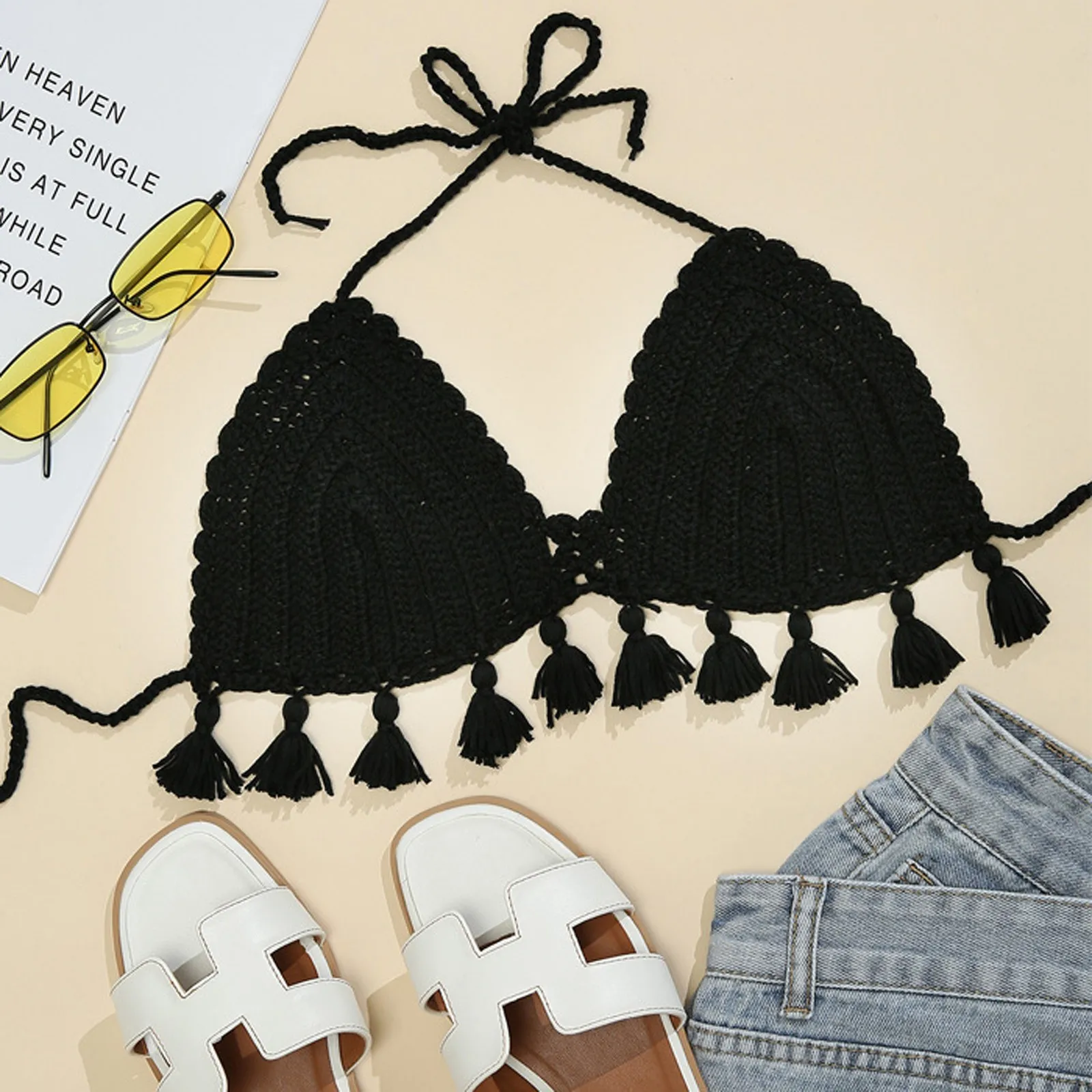Женский модный сексуальный тканый бюстгальтер-бикини ярких цветов с бретельками и бахромой