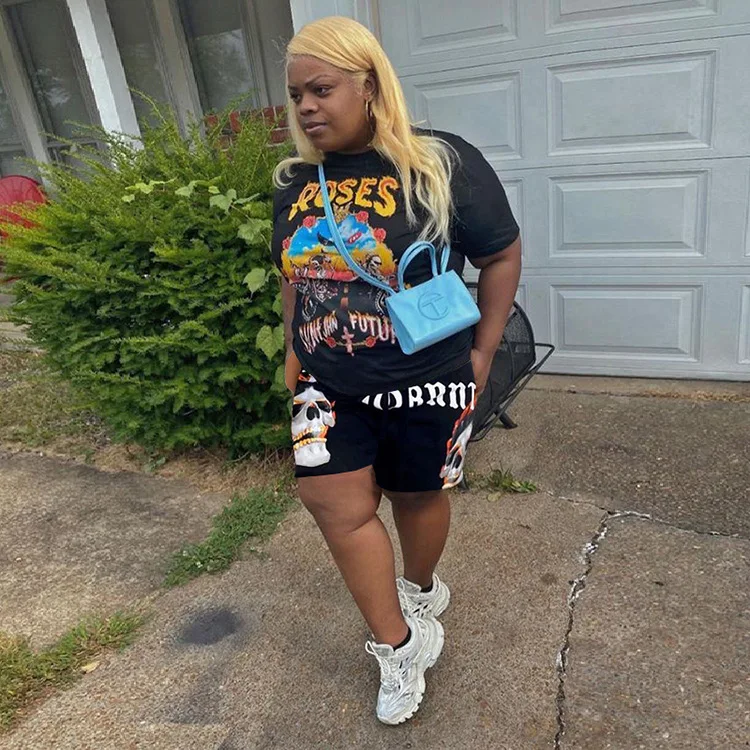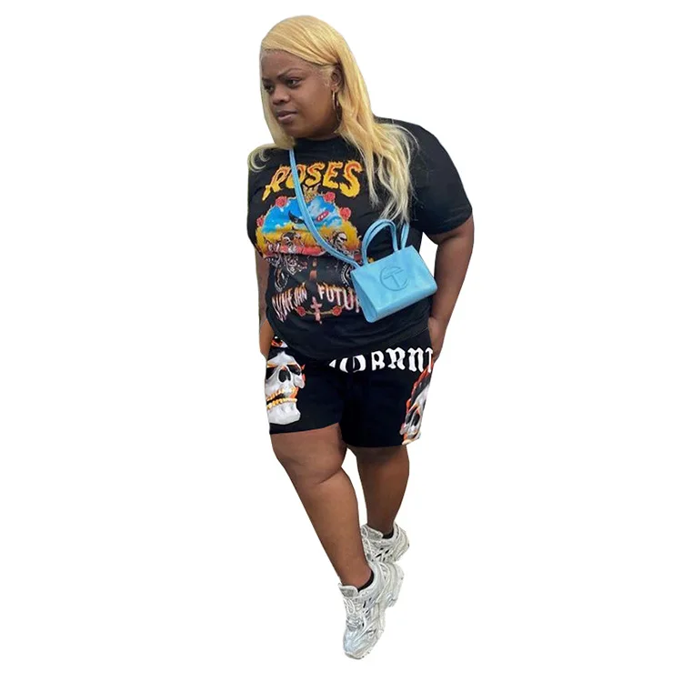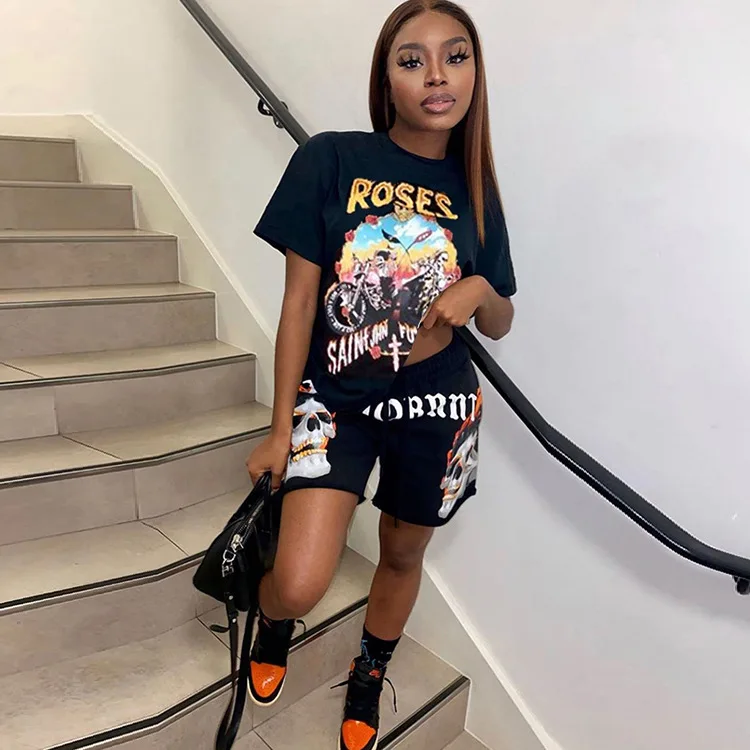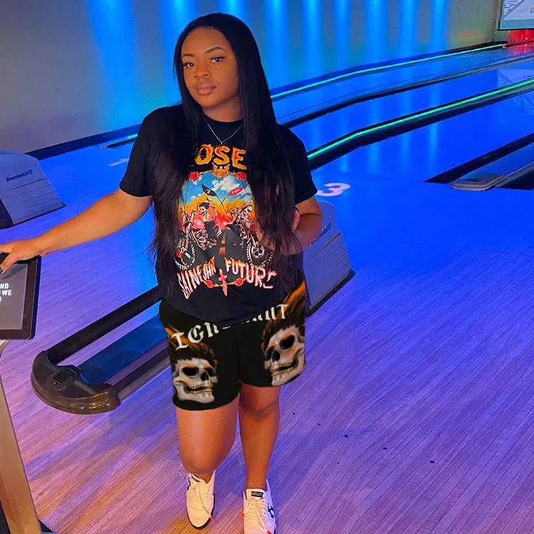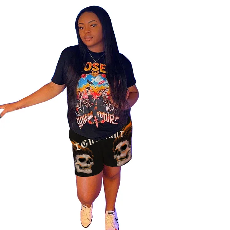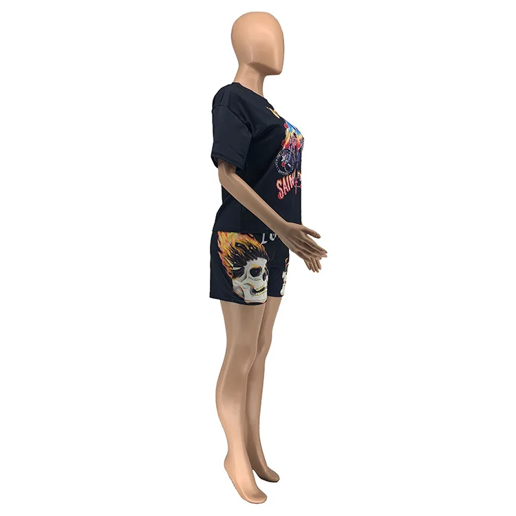 Женский спортивный костюм из футболки и брюк с круглым вырезом, повседневный костюм из двух предметов с принтом черепа, лето 2019