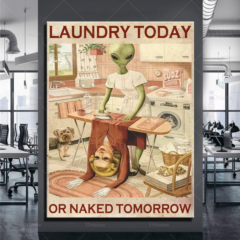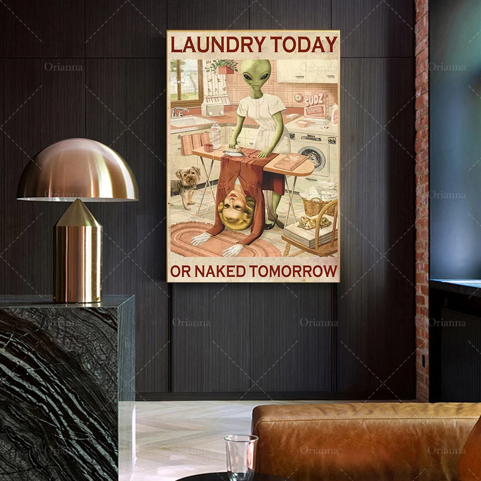 Плакат для стирки сегодня или завтра без одежды-Забавные знаки с инопланетным принтом для стирки в комнате, плакат для ванной комнаты, настенное искусство, украшение для дома