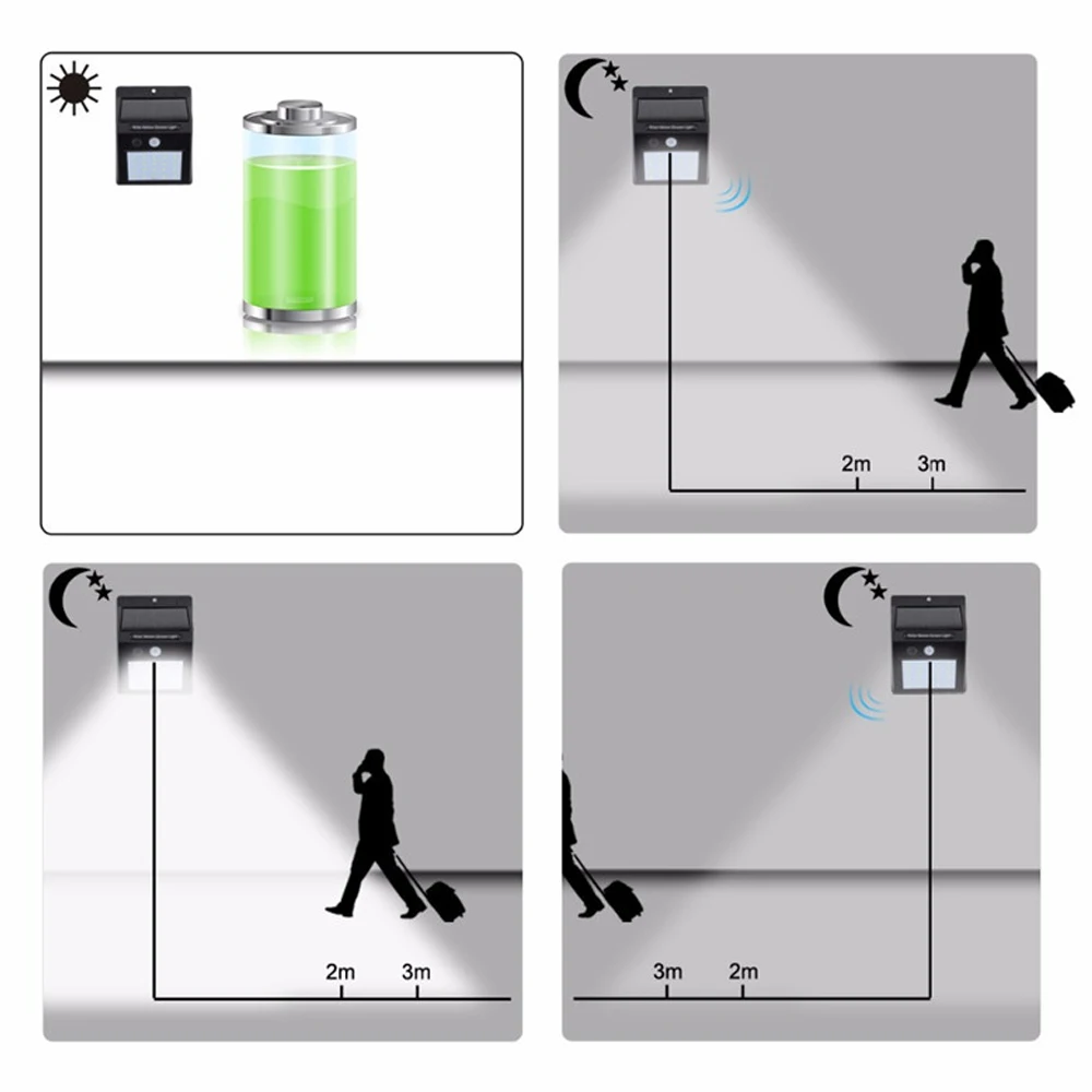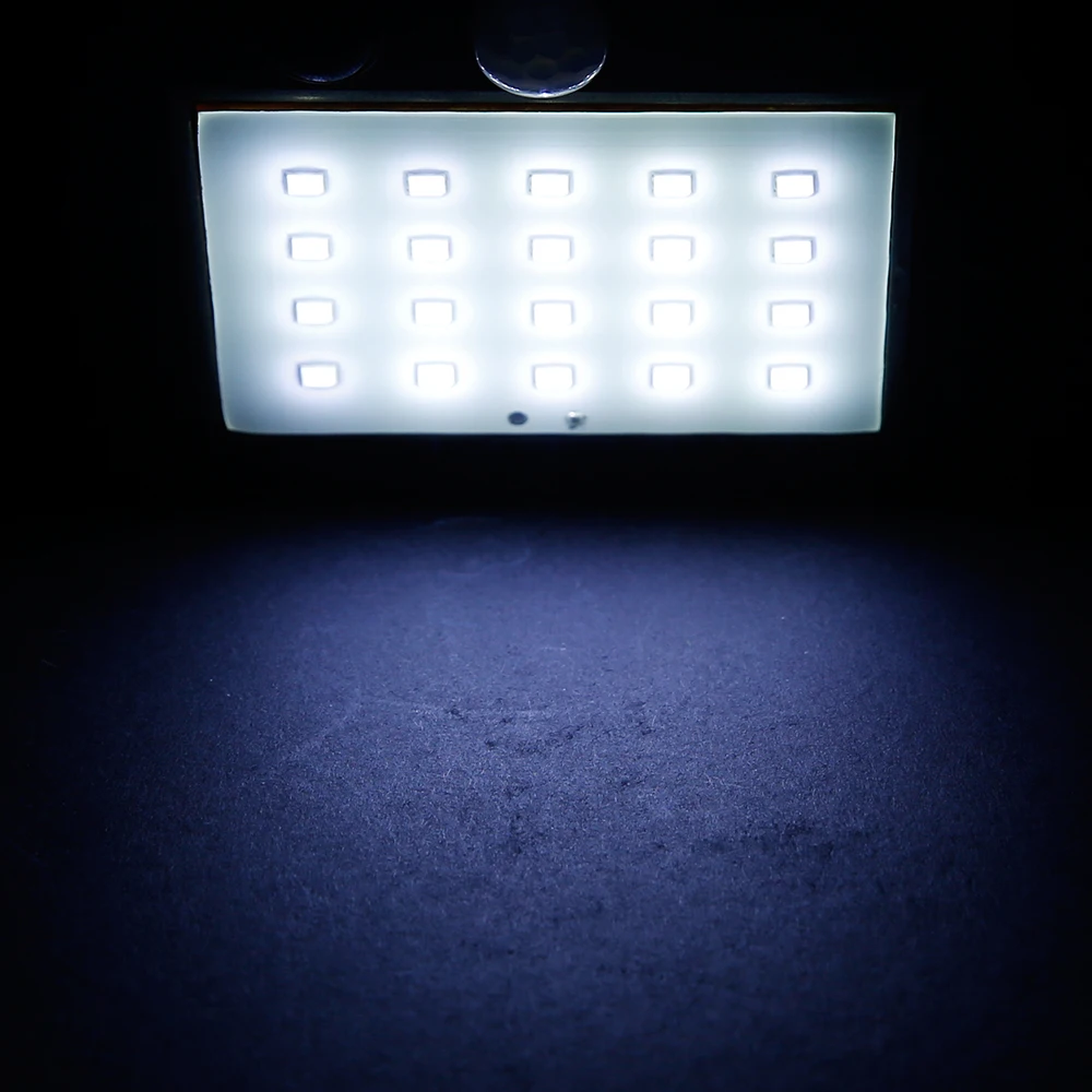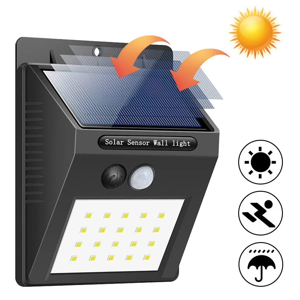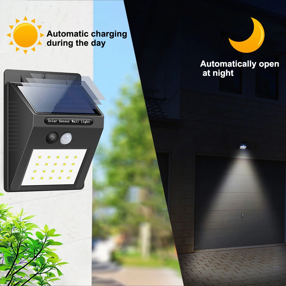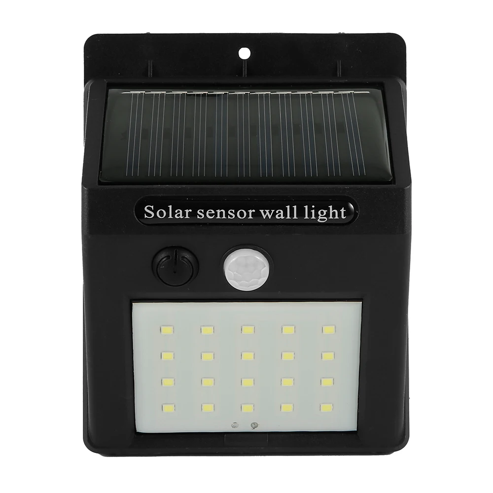 20LED светильники на солнечной батарее светильник с пассивным инфракрасным датчиком движения, наружный садовый аварийный настенный светильник для безопасности, солнечный свет для украшения садаТип лампы: на солнечной батарее настенный светильник для садаИсточник питания: солнечныйМатериал: пластик, ABSОсобенности 1: От заката до рассвета, низкое напряжение, активация движения, солнечный датчик, защита от атмосферных воздействий/дождьТип: 20 светодиодный на солнечных батареях с пассивным инфракрасным датчиком движенияСтиль: СовременныйЦвет: черныйТип упаковки: 1 штОсобенность 2: Активация движения, солнечный датчикСветодиодные лампы: 20 ламп (модернизированная версия 2835 светодиодных ламп, высокая яркость)Цветовая температура: холодный белыйСрок службы: 10000 часовСолнечная панель: 5,5 V 0,55 W (поликремний)Коэффициент конверсии: 17%Режим светильник: выкл/тусклсветильник/ярсветильникВремя задержки высосветильник: 10 сПотребляемая мощность: 4 ВтПереключатель: выкл/АвтоНочной Датчик: <10LUXИндукция светильник + инфракрасный датчикРасстояние индукции: 2-3 мУгол наклона датчика: 120 градусовРазмеры: 12 см * 9,5 см * 5 смМатериал чехла: ABSКласс водонепроницаемости: IP65Характеристики:* Аккумуляторы подзаряжаются днем, чтобы обеспечить светильник ночью.* Источник солнечного питания, экологически чистый и энергосберегающий, интеллектуальный.* Не требуется проводка и легко устанавливается.* Автоматический датчик активируется в сумерках.* Изготовлен из органического стекла светодиодный ных лампочек, безопасен и водонепроницаем.* PIR датчик движения и Ночной Датчик.* Подзаряжается от солнечного света и энергии хранения для ночного освещения.* Более 12 часов освещения после одного дневного солнечного заряда. (встроенные 1200 мАч Сменные литиевые батареи 18650, для полной зарядки требуется всего 8 -10 часов).* Водонепроницаемый IP65, термостойкий и прочный.