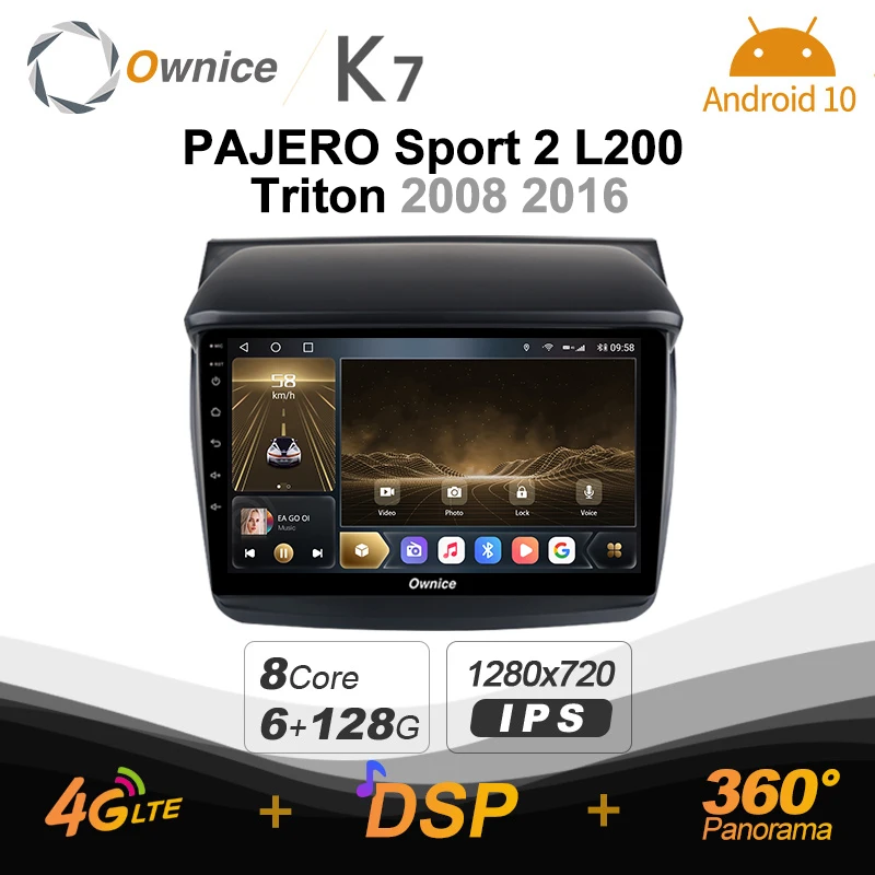 Автомагнитола Ownice K7 для Mitsubishi PAJERO Sport 2 L200 Triton, Аудиомагнитола 6 ГБ + 128 Гб, android 2008, BT 2016, 10,0, 4G, LTE, SPDIF, 5,0, 360