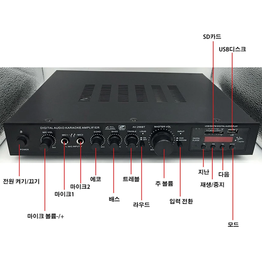 Особенность:1.5.0 усилитель подключения динамика с радио2,720 Вт Макс. Общая производительность3. Регулируемая громкость микрофона4. Поставляется с пультом дистанционного управления5. Управление с синей подсветкой6. Светодиодный дисплей7. Регулируемый эффект задержки микрофона8. Поддержка FM/AM радио.