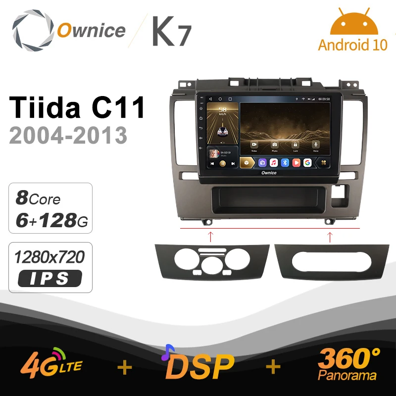 Автомагнитола K7 Ownice, 6 ГБ ОЗУ, 128 Гб ПЗУ, Android 10,0, для Nissan Tiida C11 2004-2013, 360, панорамная оптическая, 5G, Wi-Fi