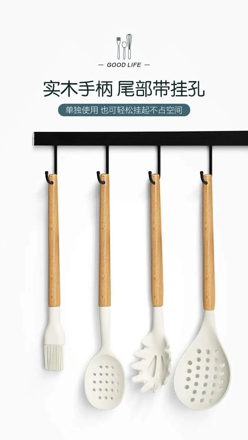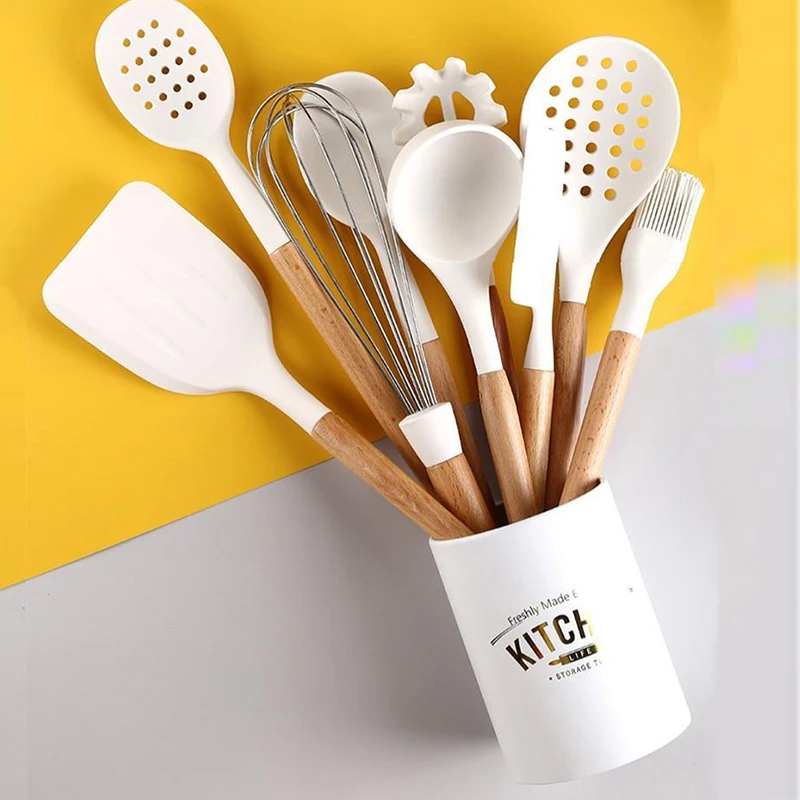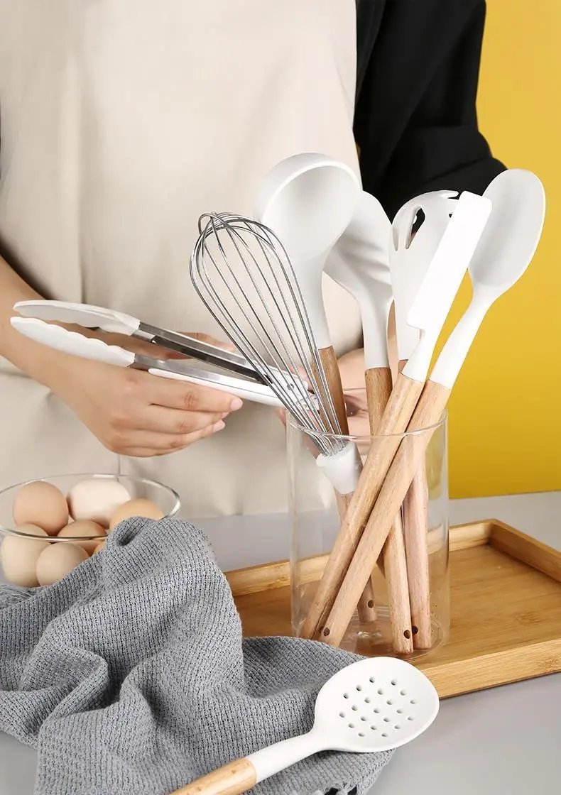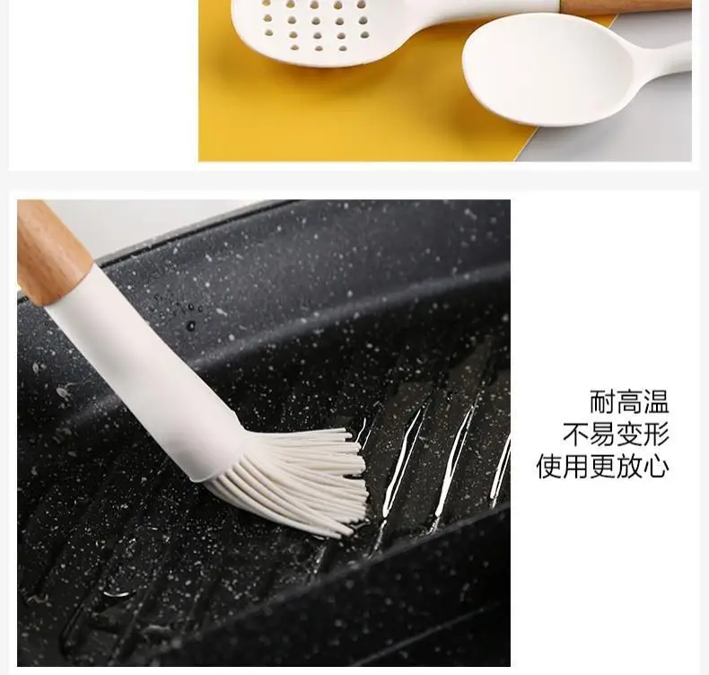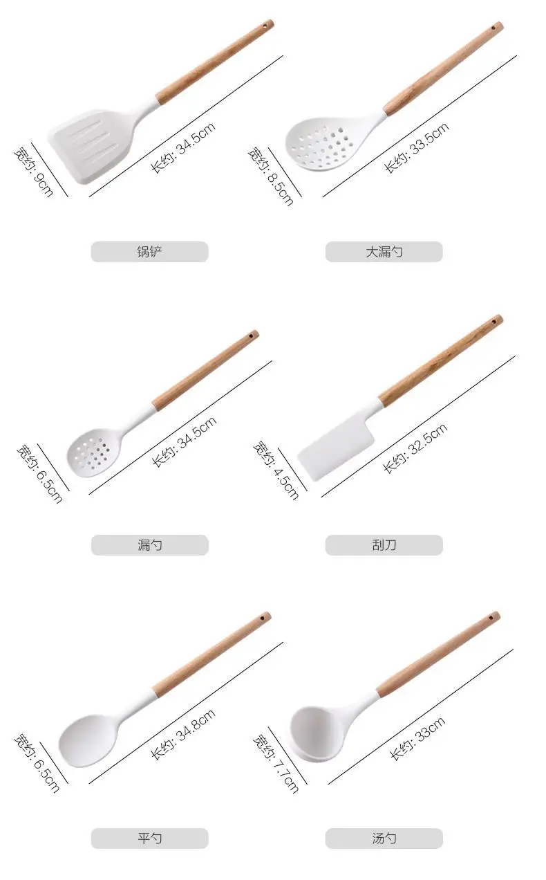 Набор силиконовых столовых приборов-это кухонный помощник, антипригарный, легко моющийся, прочный и безопасный, нетоксичный и безвредный. Подходит для всех видов пищи и приготовления пищи и кухонных принадлежностей, включая сковородки, взбитые сливки, масло, мороженое и т. д., включая лопатку, кисть для приправ, остроконечную лопатку, филе, ковш, фаска с прямыми краями, ложка, щипцы и вилки для макаронных изделий отлично подходят для всех видов пищи и приготовления пищи.