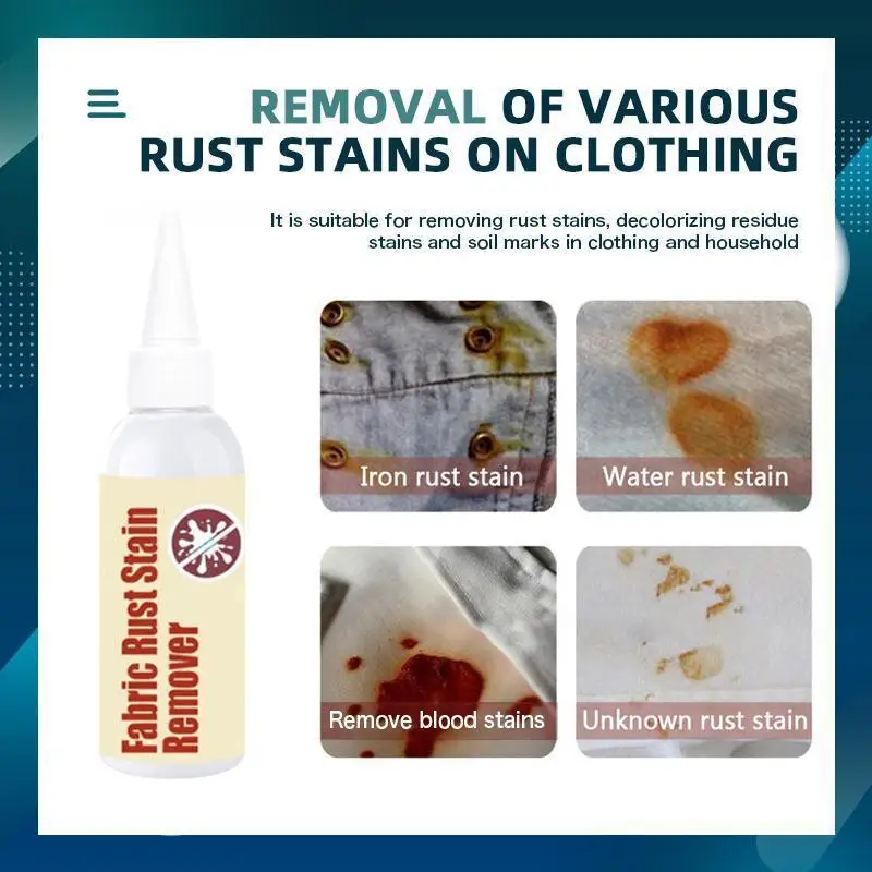 Широкий спектр примененияОн подходит для пятен от ржавчины, водяных пятен, неизвестных пятен макулы, пятен от почвы, других металлических растворов, обесцвечивающего остаточного пигмента на тканях и т. Д. Сделайте вашу одежду совершенно новой.