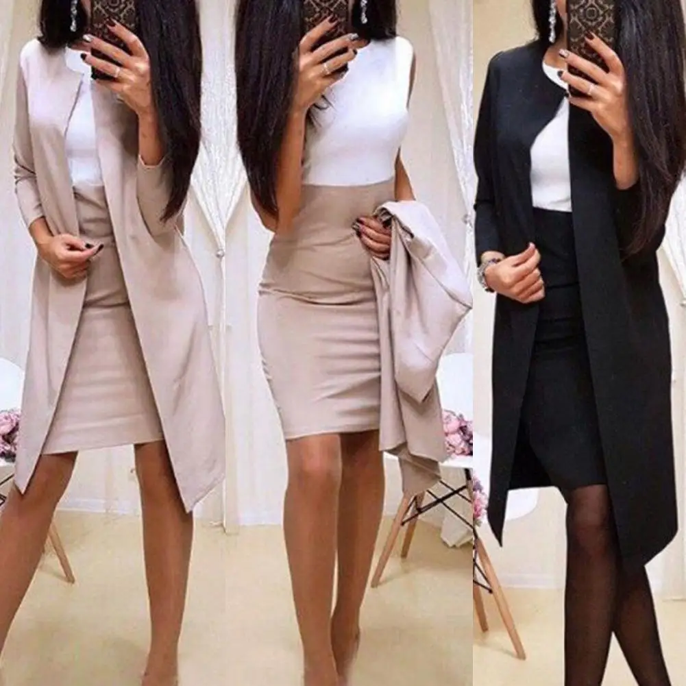 Женский офисный осенний однотонный Длинный блейзер, облегающий костюм с мини-юбкой, 2 шт.