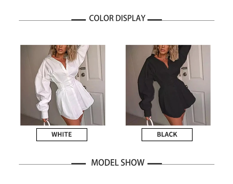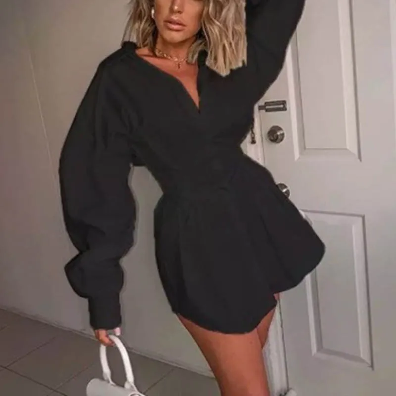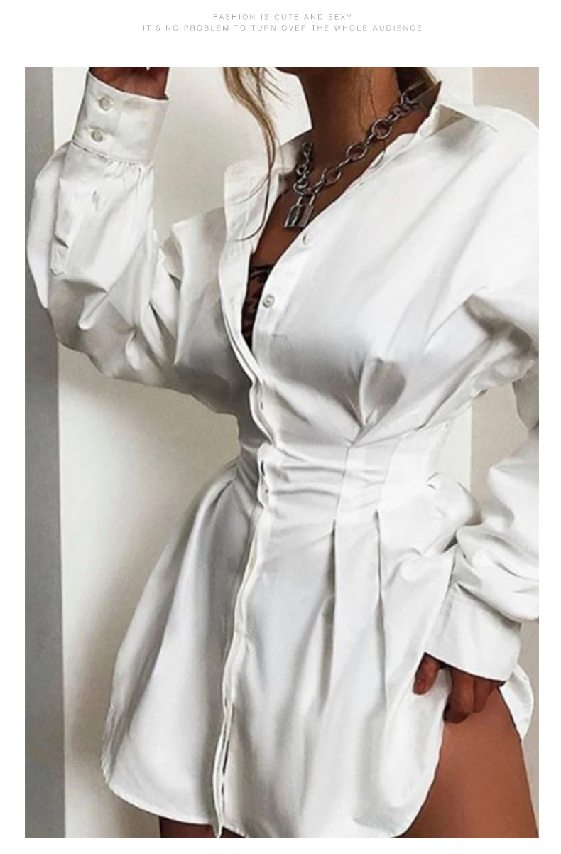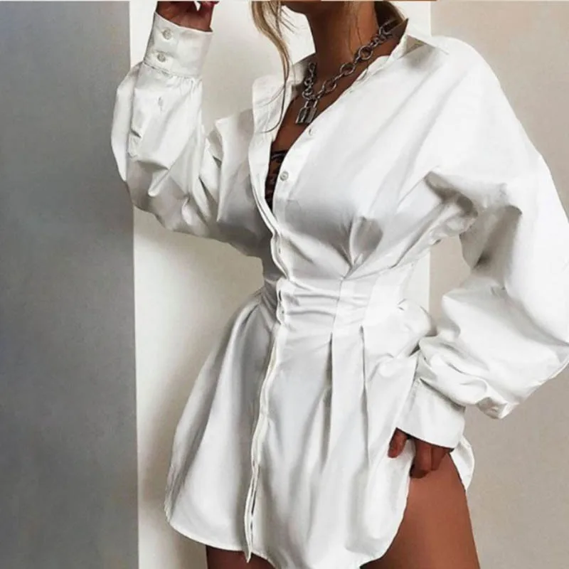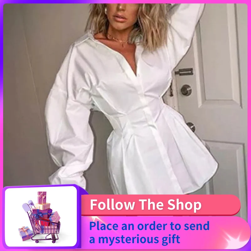 Женское офисное платье-рубашка Ganiazzest, облегающее мини-платье-рубашка средней длины с пышными рукавами и V-образным вырезом, с завышенной талией