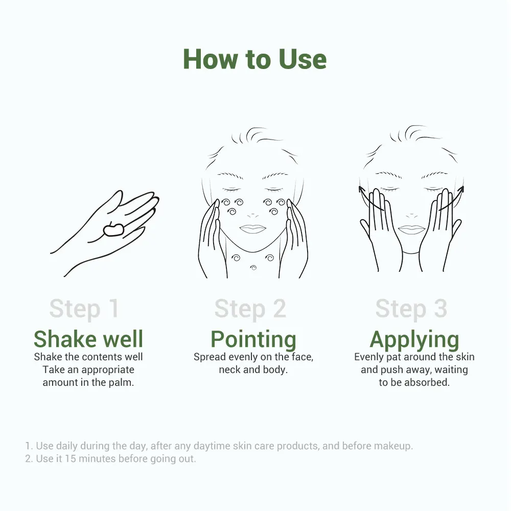 Как использовать Шаг 1 Хорошо взболтать Хорошо встряхните содержимое, положите необходимое количество в ладонь. Шаг 2 Указание Равномерно распределите по лицу, шее и телу. Шаг 3 Применение Равномерно похлопайте по коже и Отодвиньте, ожидая впитывания. 1. Используйте ежедневно в течение дня, после любых дневных средств по уходу за кожей и перед макияжем. 2. Используйте его за 15 минут до выхода на улицу.
