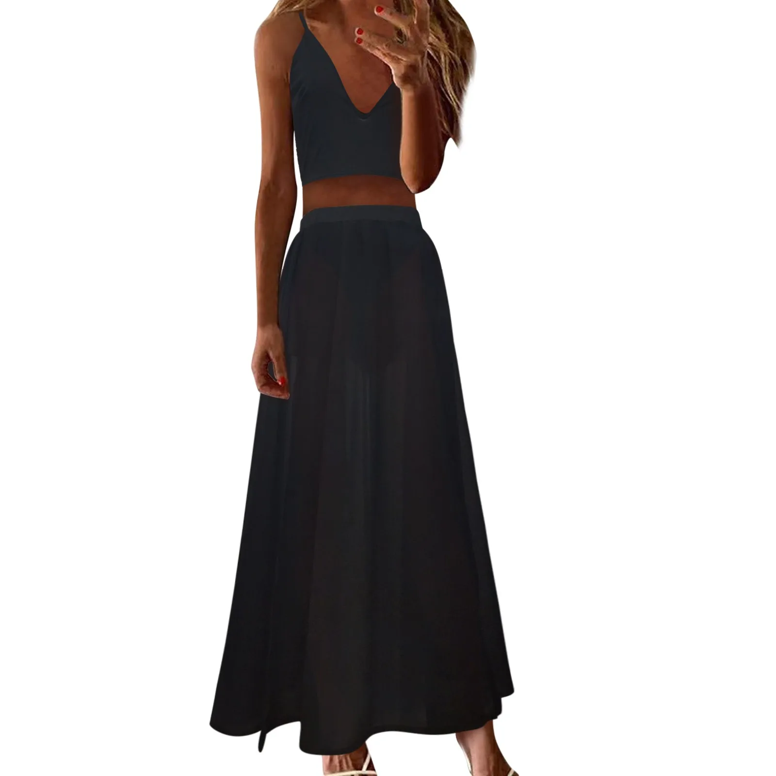 Женский праздничный комплект из топа с V-образным вырезом и прозрачной юбки макси с высоким разрезом, соблазнительные повседневные комплекты летнего платья 2021