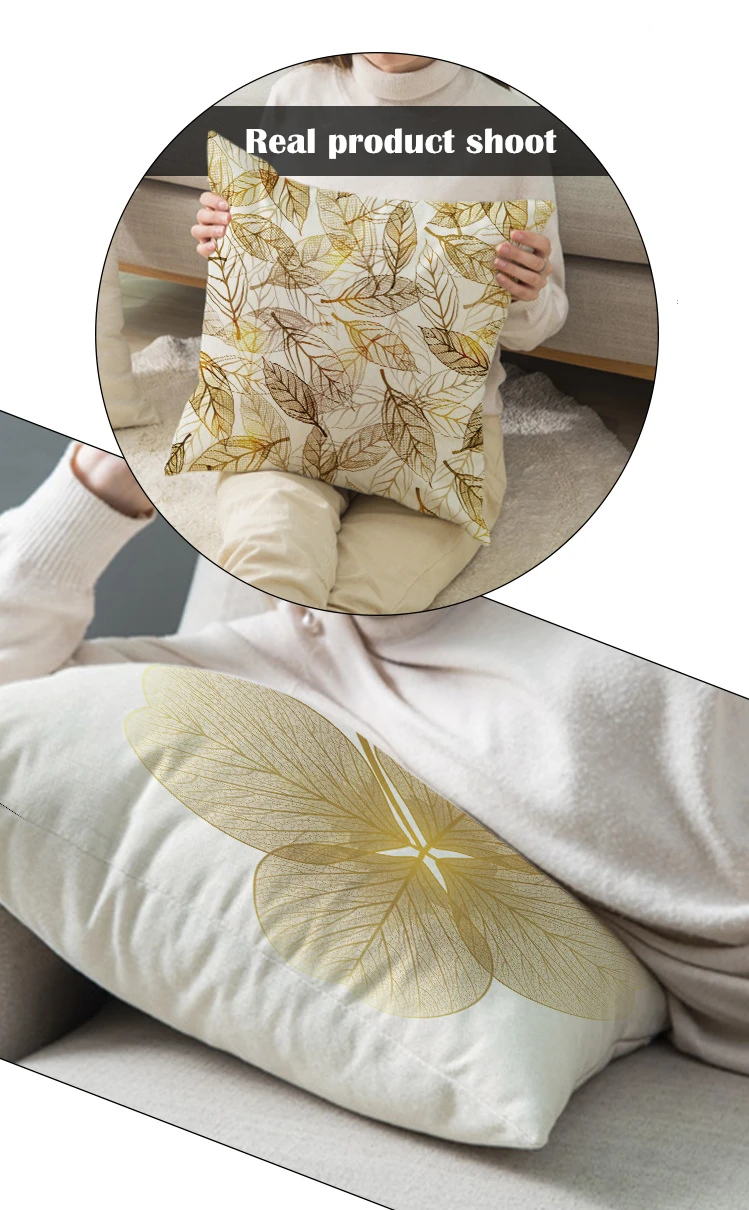 1.Высококачественный полиэфирный персиковый материал. 2. Технология цифровой печати и передачи тепла. 3.Невидимая молния, легко вставляется, идеально сочетается с подушкой. 4.2020 новые Золотые Бронзовые растения оставляет изображения. 5. Комплексное применение для домашнего декора. 6. Легко ухаживать, машинная стирка.