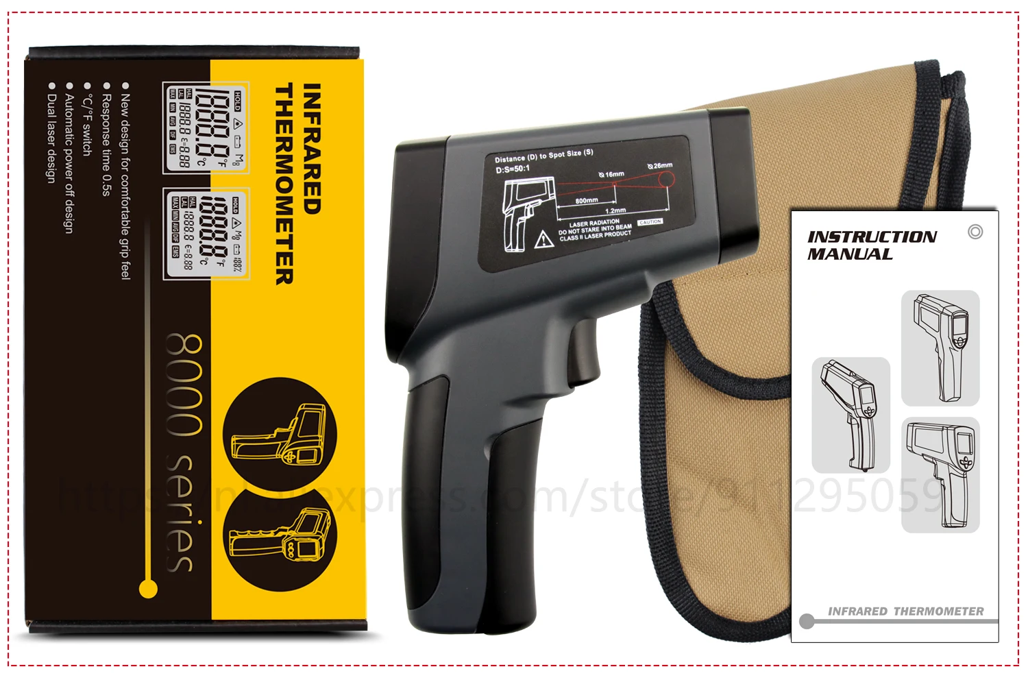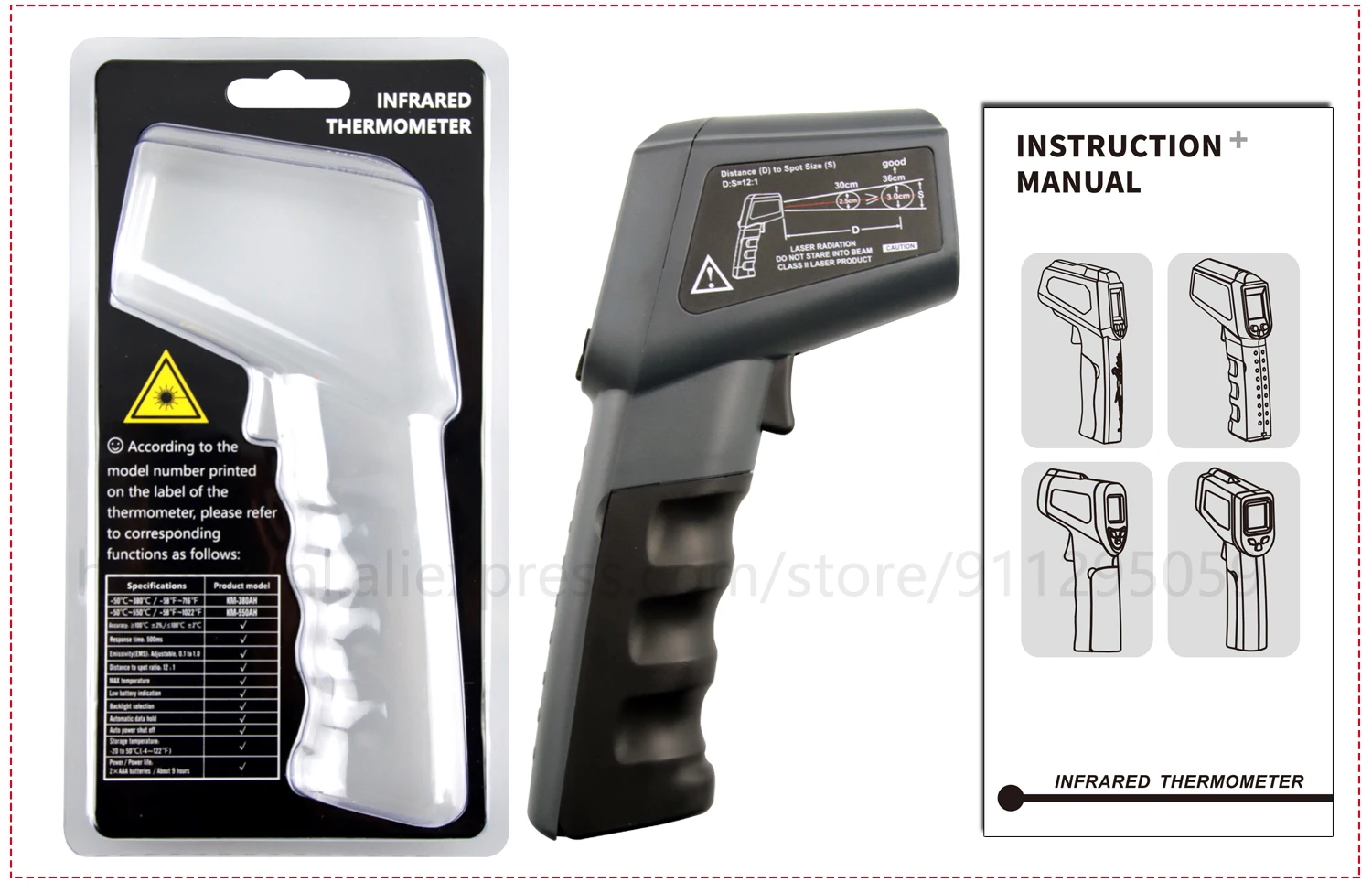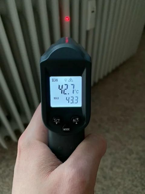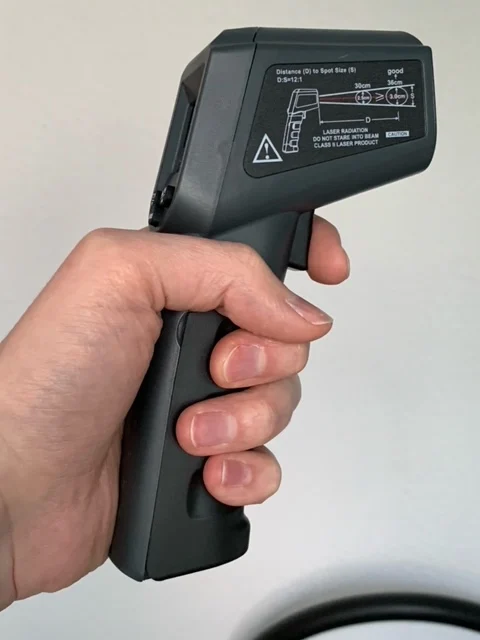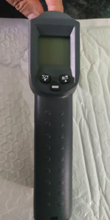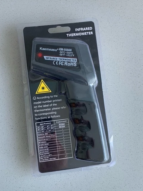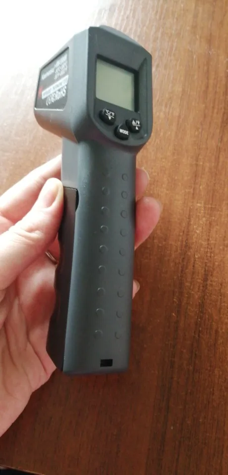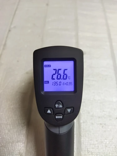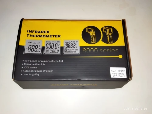Термометр хорошо упакован. В комплект входит напечатанное руководство; Батарейки в комплект не входят. Точность выглядит нормально. Дисплей имеет хорошую контрастность, легко читается, а подсветка достаточно ровная. Лазерная указка была слегка смещена на правую сторону. Я сам открывал термометр (очень легко сделать) и регулировал ориентацию лазерного модуля. В целом хорошее соотношение цены и качества.