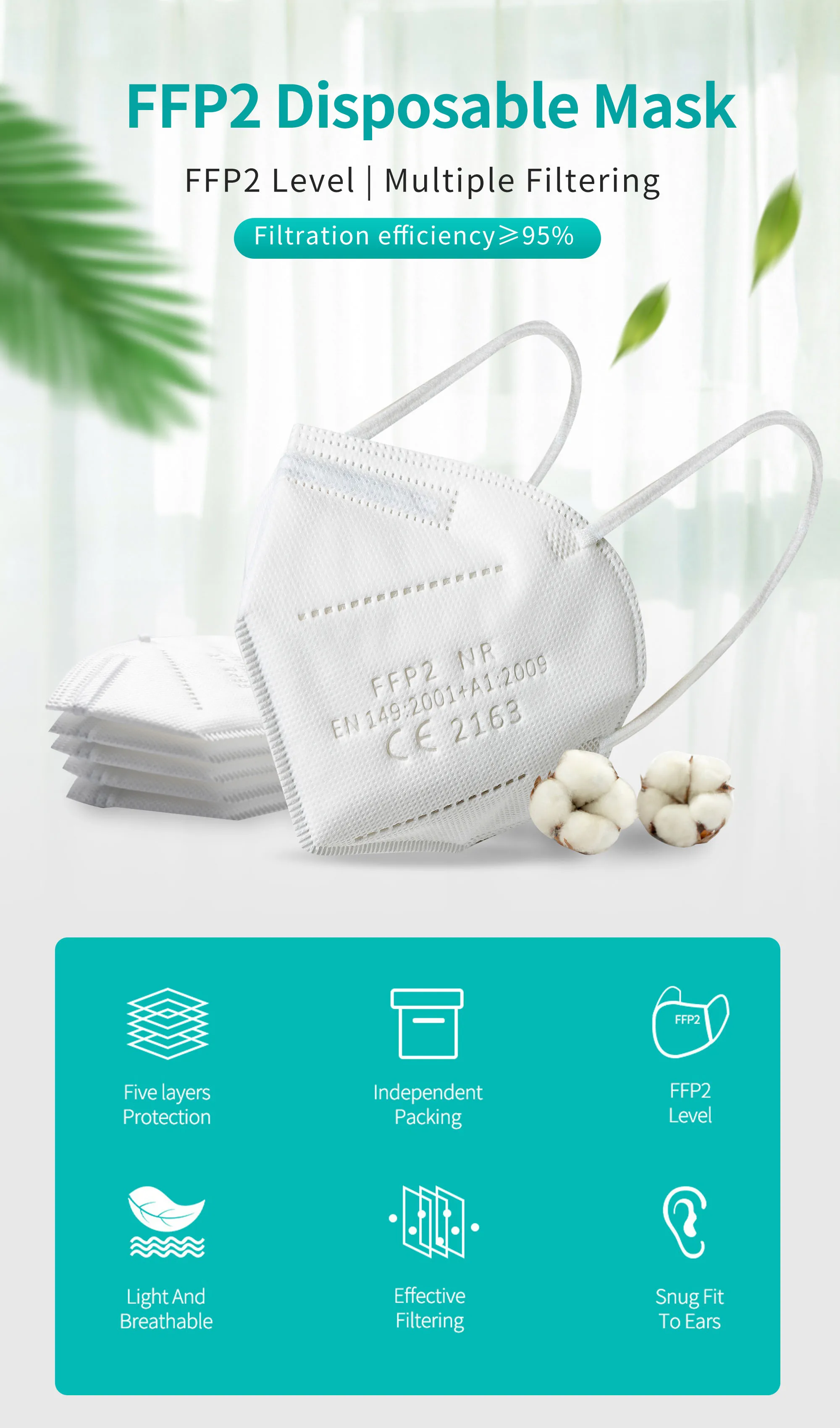 FFP2 маски, гигиенические и удобные для использования. Изготовлен из высококачественного материала, безопасный, мягкий и удобный. 95% фильтрации, обеспечивают защиту от пыли для вас. Защитите вас от воздушных частиц и загрязнения. Эластичные ремешки и регулируемый зажим для носа для различных форм и размеров лица. Идеально подходит для ежедневного использования и активного отдыха. Защита от пыли Анти PM2.5 Фильтр PM2.5 и вредное вещество в воздухе, Защитите ваше здоровье! Цвет: белый/красный/розовый/серый/синий/желтый/черный Количество: 10 масок/упаковка Тип: Ношение ушей Материал: Высококачественная Нетканая ткань и т. Д.
