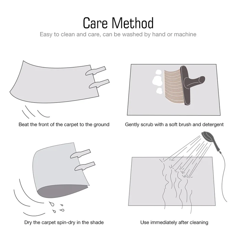 1. Поверните переднюю часть ковра на землю2. Аккуратно протирайте мягкой щеткой и моющим средством3. Сушить ковер в тени4. Используйте сразу после очистки