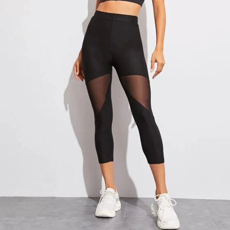 Леггинсы женские эластичные, черные, лоскутные сетчатые гетры