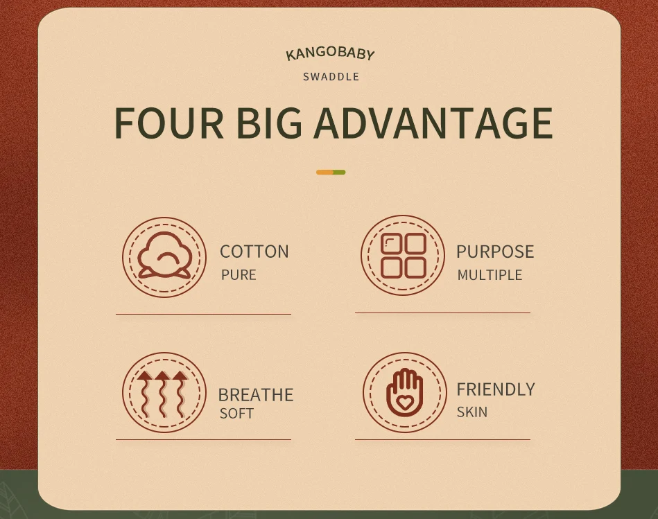 Бренд: KangobabyТовар: муслиновая пилаМатериал: 70% бамбук + 30% хлопокРазмер: 120 см x 110 смПодходящий вес: каждый ребенокСертификация: SGS / CPSIAМетоды использования: одеяло для новорожденныхМарля для ванныДетский спальный мешокЧехол для детской коляскиПреимущества: Ваш ребенок будет чувствовать себя более комфортно и тепло.Чтобы ваш ребенок чувствовал себя более безопасно, качество сна улучшается и снижает плач.
