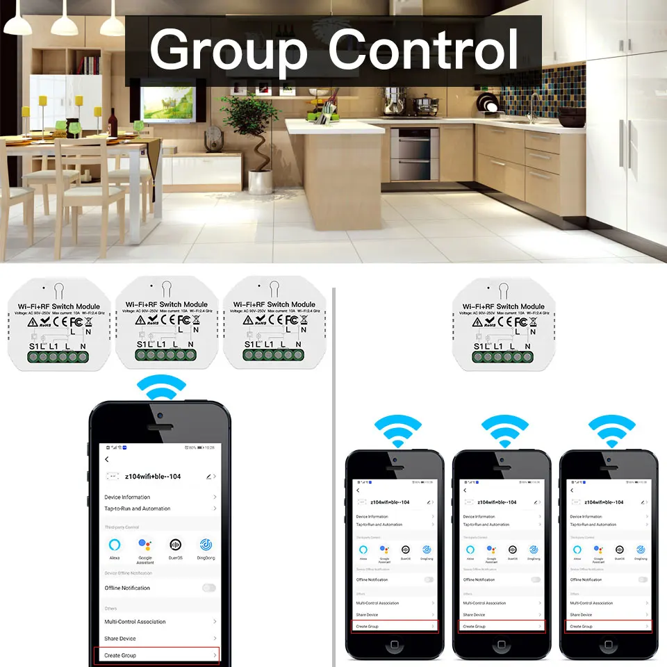 Работа с Alexa Google HomeПриложение: Smart Life/TuyaПоддерживает только сеть 2,4G;Особенности:1. Тем временем подходит для сброса и перекидного выключателя2. Пульт дистанционного управления RF433 / App. (Примечание: пульт дистанционного управления RF433 не входит в посылка, и вам нужна самостоятельная покупка.)3. Мульти-контроль в гораздо более простой способ4: новый режим сопряжения с WiFi + Bluetooth.5: функция отключения памяти.6. Этот умный wifi модуль с мини-дизайном подходит для ЕС/настенный переключатель стандарта Великобритании коробки.