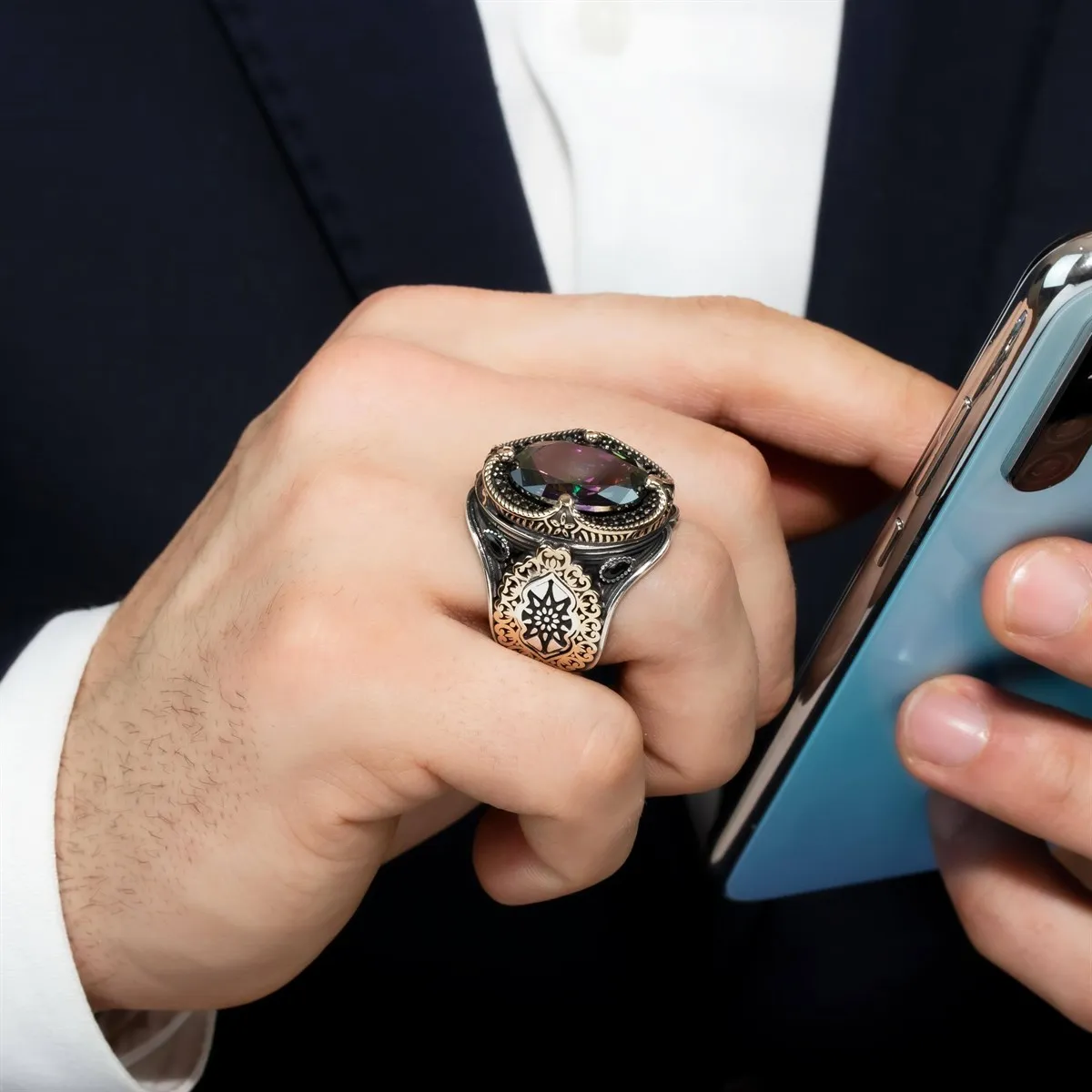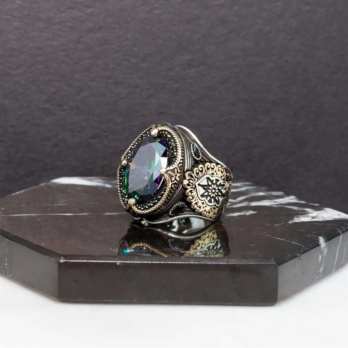 Мужское серебряное кольцо с изображением Мистик топаза