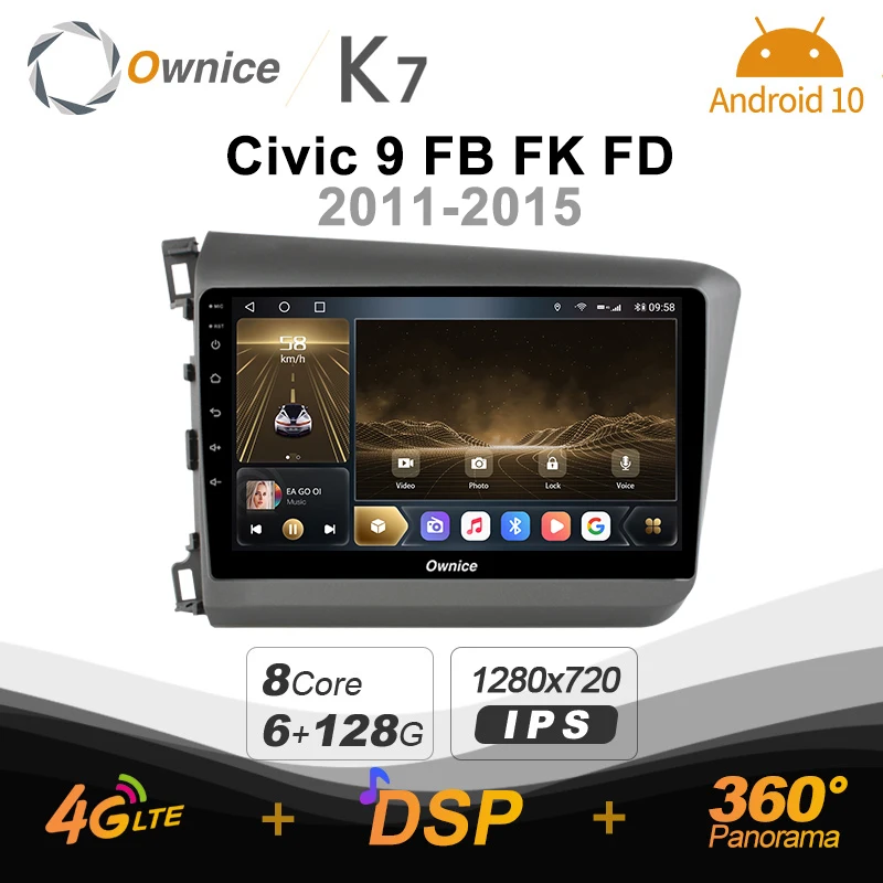 Автомагнитола Ownice K7, Android 10,0, 6G + 128G, для Honda Civic 9, FB, FK, FD 2011-2015, радиосистема 360, панорамная, 4G, LTE