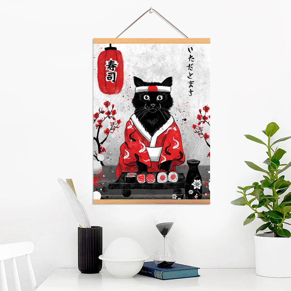 Холст для украшения дома, Постер японской кухни, картины с принтом милого кота, настенное искусство, деревянный свиток, подвесная картина, прикроватный фон