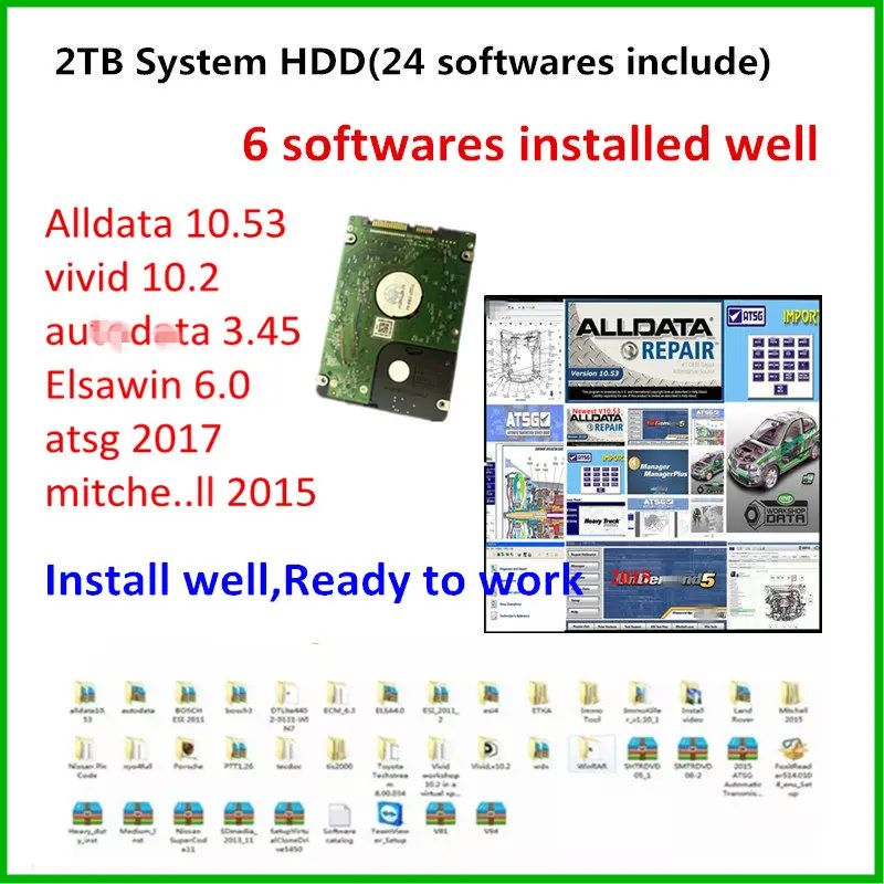 1. Вы получите 2 ТБ HDD с 24 программным обеспечением (24 программного обеспечения в 2 ТБ HDD, Alldata 10,53 и mit.ch.ll 2015, atsg , vivid 10,2, atsg 2017, auto-data 3,45, els.w. В 6,0 шесть программного обеспечения Установите хорошо в Ноутбук готов к использованию, другое программное обеспечение вы должны установить самостоятельно.)