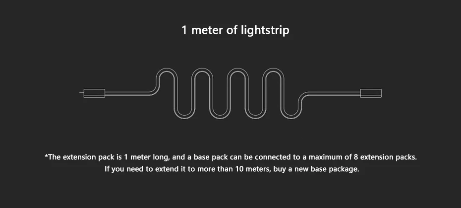 Удлинительный пакет длиной в один метр, без источника питания и переключателя в посылка, он не может использоваться отдельно. Его необходимо использовать с базовой упаковкой. 1 Базовый Пакет может использоваться с 8 расширениями (до 10 метров). Базовый Пакет можно приобрести отдельно.